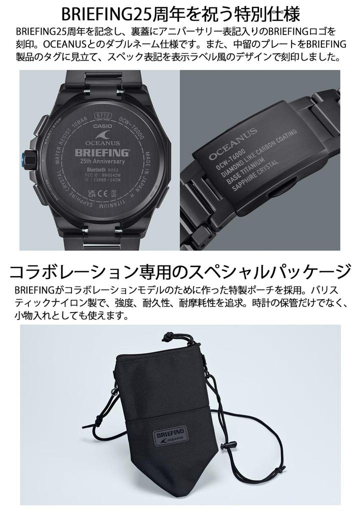 Два фирменных цвета едва заметно проглядывают: Верхняя часть заводной головки покрыта синим IP, цветом бренда OCEANUS, а на нижней стороне безеля присутствует культовая красная линия BRIEFING.. Цвета, выглядывающие сбоку, выражают игривость и идентичность. Застежка имеет лазерную гравировку со спецификациями часов, напоминающую бирки, которые можно найти на военных сумках.. На задней крышке выгравирована специальная отметка в честь 25-летия сотрудничества BRIEFING. Также в комплекте оригинальный шейный кошелек.