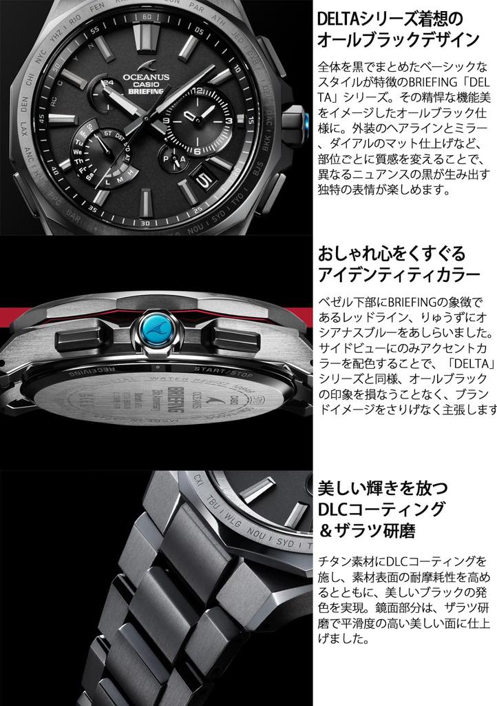 Это коллаборационная модель между OCEANUS, который стремится к высококачественной отделке и красивым формам в рамках концепции бренда «Элегантность, Технологии», и BRIEFING, брендом багажа, известным своей выдающейся функциональной красотой.. Эта новая модель, посвященная 25-летию BRIEFING, выполнена в теме «НОВЫЙ СТАНДАРТ». Вдохновленный серией BRIEFING DELTA, дизайн в полностью черном цвете излучает изысканное, но игривое качество.. СЕРИЯ BRIEFING DELTA предлагает свежую интерпретацию базовых стилей, воплощая фирменную «прочную функциональную красоту» BRIEFING. Эта серия представляет собой возвращение к истокам дизайн-директора, который курирует все дизайны BRIEFING, и была создана с желанием «установить новый стандарт для BRIEFING». Эта коллаборационная модель представляет собой «НОВЫЙ СТАНДАРТ», который адаптируется к меняющимся временам и стилям работы, стремясь к OCEANUS, подходящему для различных стилей жизни, как в рабочее, так и во внерабочее время.. Корпус с его очень гладким многогранником и острыми краями, отполированный с использованием полировки Zaratsu, и 12-гранный безель излучают поразительную солидность.. Дизайн характеризуется сильным акцентом на проработку поверхности и финишной обработкой «волосок».. Широкие центральные звенья браслета расположены выше внешних звеньев, создавая ощущение прочности и обеспечивая удобную посадку на запястье.. СЕРИЯ DELTA отличается цельным, полностью черным дизайном, исключающим культовую красную линию BRIEFING и другие элементы дизайна с ее внешней стороны.. Модель OCW-T6000BR также имеет матовый черный циферблат. Логотип OCEANUS также выполнен в едином темно-сером цвете, а контрастные черные текстуры выражают изысканную утонченность.
