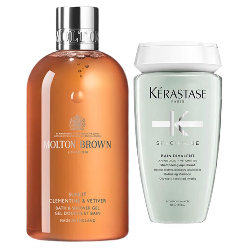 Elevate your hair and body care routine with this luxurious set featuring Kérastase and Molton Brown. The Kérastase Dual Function Shampoo (250ml) targets oily scalps, provides soothing relief, and adds volumizing lift, making it suitable for all hair types. Complementing this, the Molton Brown Citrus Bath & Shower Gel (300ml) offers an invigorating and fragrant cleanse, leaving your skin refreshed and delicately scented. A perfect duo for comprehensive care.