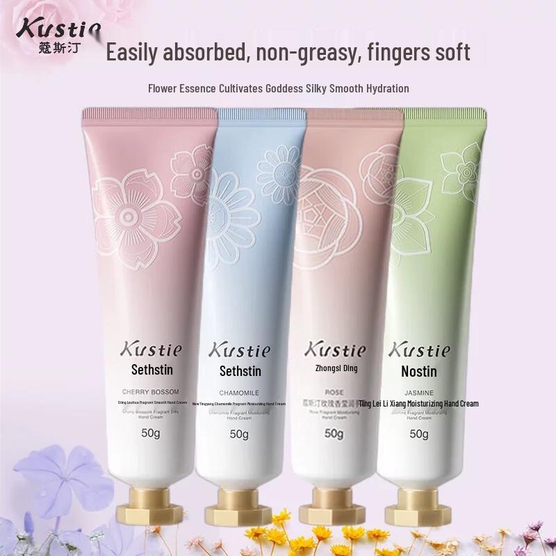 Indulge your hands with the Kustie Four Scent Moisturizing Hand Cream Set. This luxurious collection includes hand creams infused with the delicate aromas of Cherry Blossom, Rose, Jasmine, and Chamomile. Each cream provides deep hydration and nourishment, leaving your skin soft, smooth, and beautifully scented. Perfect for daily use, this set ensures your hands stay moisturized and healthy with a lasting 4-year shelf life.