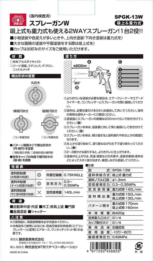 SK11 SPGK-13W Двухрежимный воздушный краскораспылитель, тип всасывания и гравитационный, диаметр сопла 1,3 мм