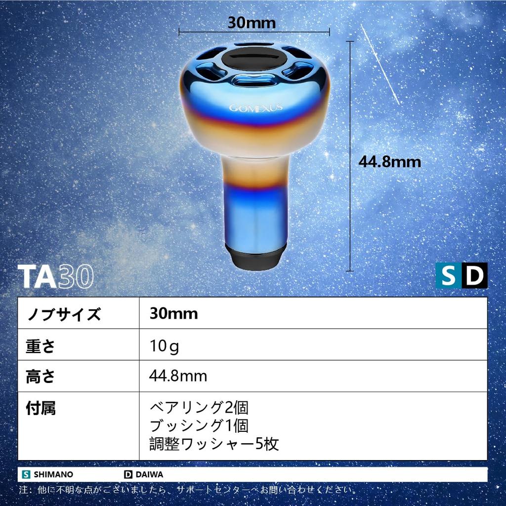 [Product Specifications] Diameter: 30mm Weight: 10g Material: Titanium alloy *Accessories: Stainless steel bearings x 2, adjustment shims x 5, aluminum bushing x 1, L-shaped wrench