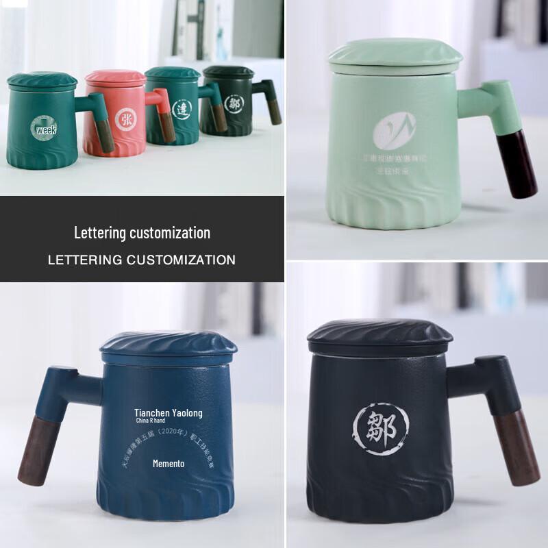 Cha Xun Ceramic Tea Mug with Lid, Infuser, and Wooden Handle
