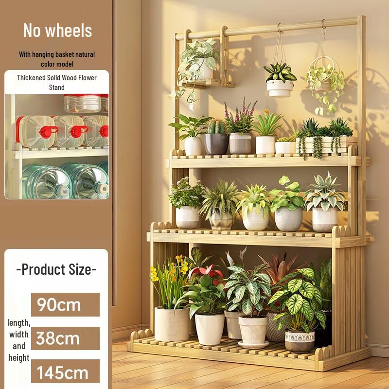 Natural Wood Solid Flower Pot Holder with Hanging Basket
