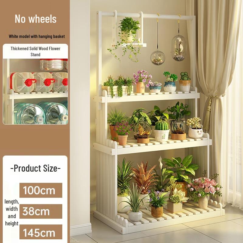White Solid Wood Ladder Flower Stand with Hanging Basket, 100cm