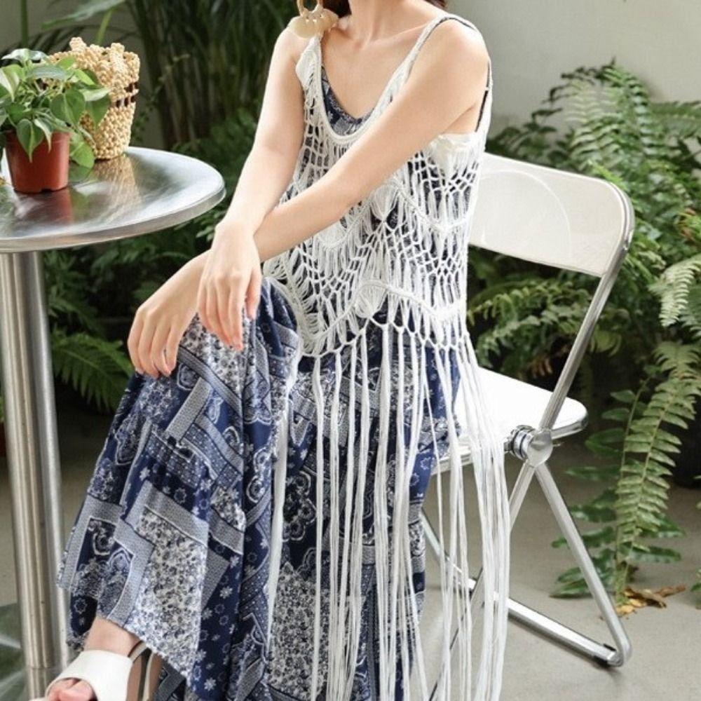 Bohemian Style Beach Dress Polyester Fibre Tassel Vest Elegant Knit Gown Beach Vacation — купить товар онлайн с бесплатной доставкой по всему миру!