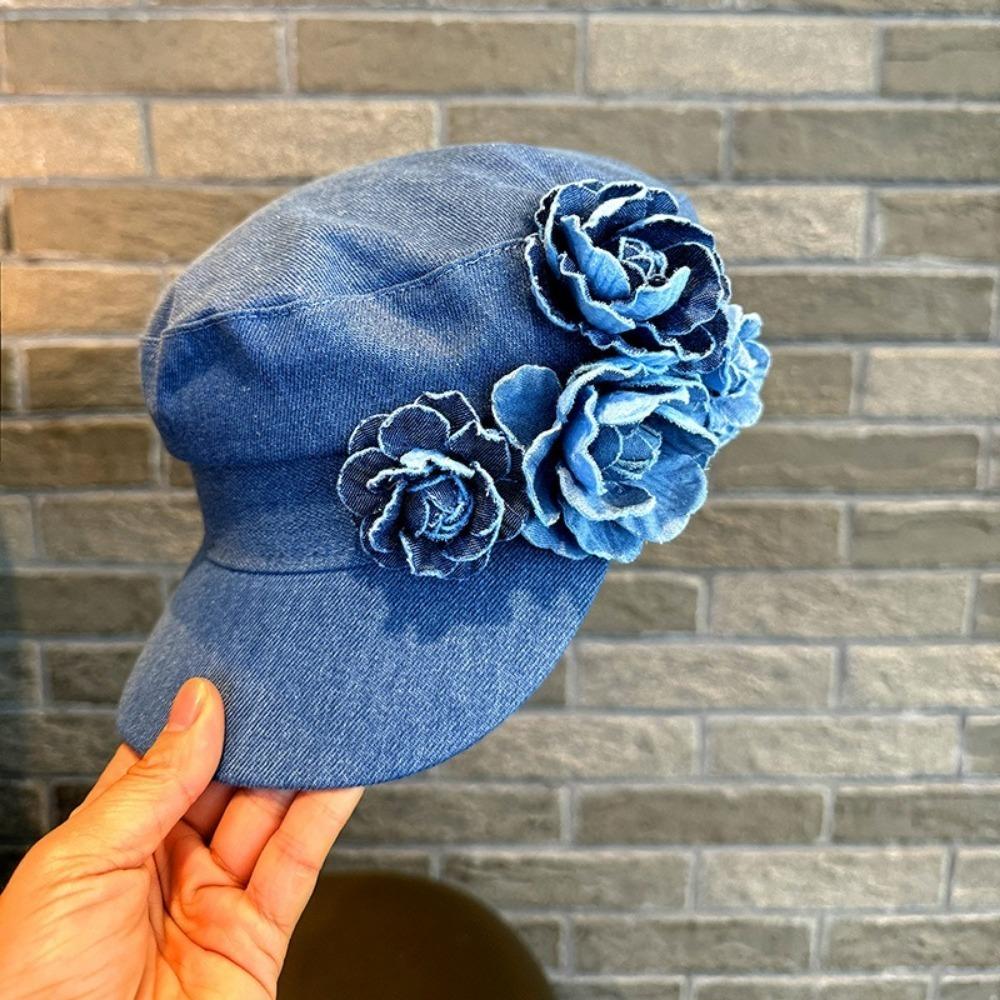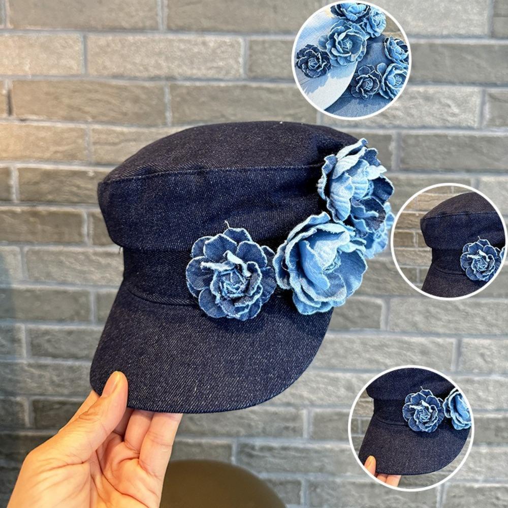 Сладкая ковбойская кепка с плоским верхом, темно-синяя, хлопковая, с большим цветком, джинсовая восьмиугольная шляпа, солнцезащитная шляпа, студенческая шляпа