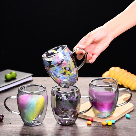 Пленительный цветочный дизайн: Чашка украшена яркими, красочными лепестками, вплавленными в стекло.. При наполнении напиток создает потрясающий визуальный эффект, напоминающий распускающиеся цветы внутри чашки, добавляя художественный и успокаивающий штрих к вашему напитку.
