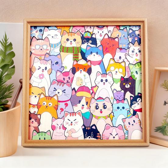 The puzzle features irregular cat-shaped pieces that challenge your creativity while assembling a unique photo frame decoration. Ideal for cat lovers, this DIY project not only enhances your home decor but also showcases your artistic talent.