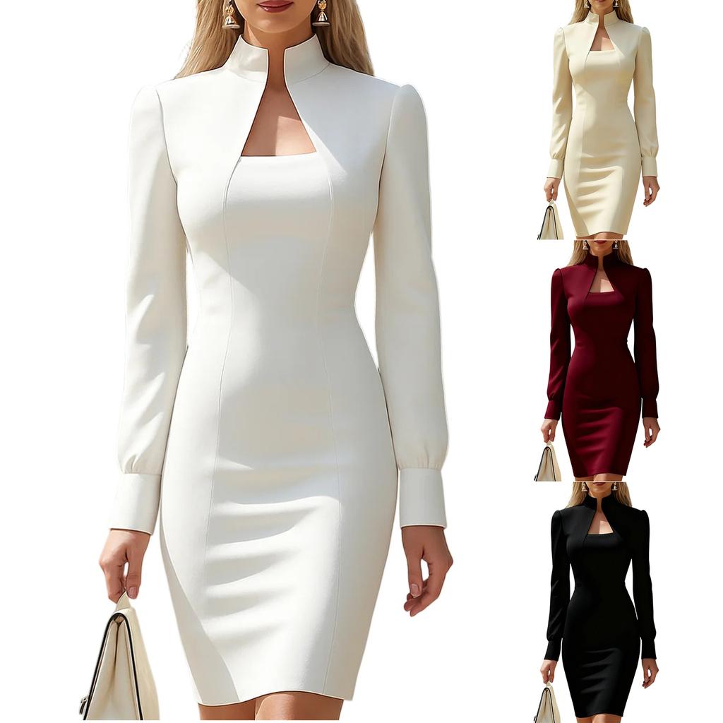 Женское элегантное однотонное банкетное платье с высоким воротом и длинными рукавами, приталенное