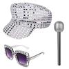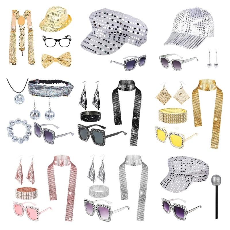 Package 1: Hat, Sunglasses, Bowtie, Shoulder Bands. Package 2: Hat, Sunglasses. Package 3: Hat, Sunglasses, Earrings. Package 4: Sunglasses, Bracelet, Necklace, Earrings, Headband. Package 5: Sunglasses, Bracelet, Earrings, Long Scarf. Package 6: Hat, Sunglasses, Microphone.