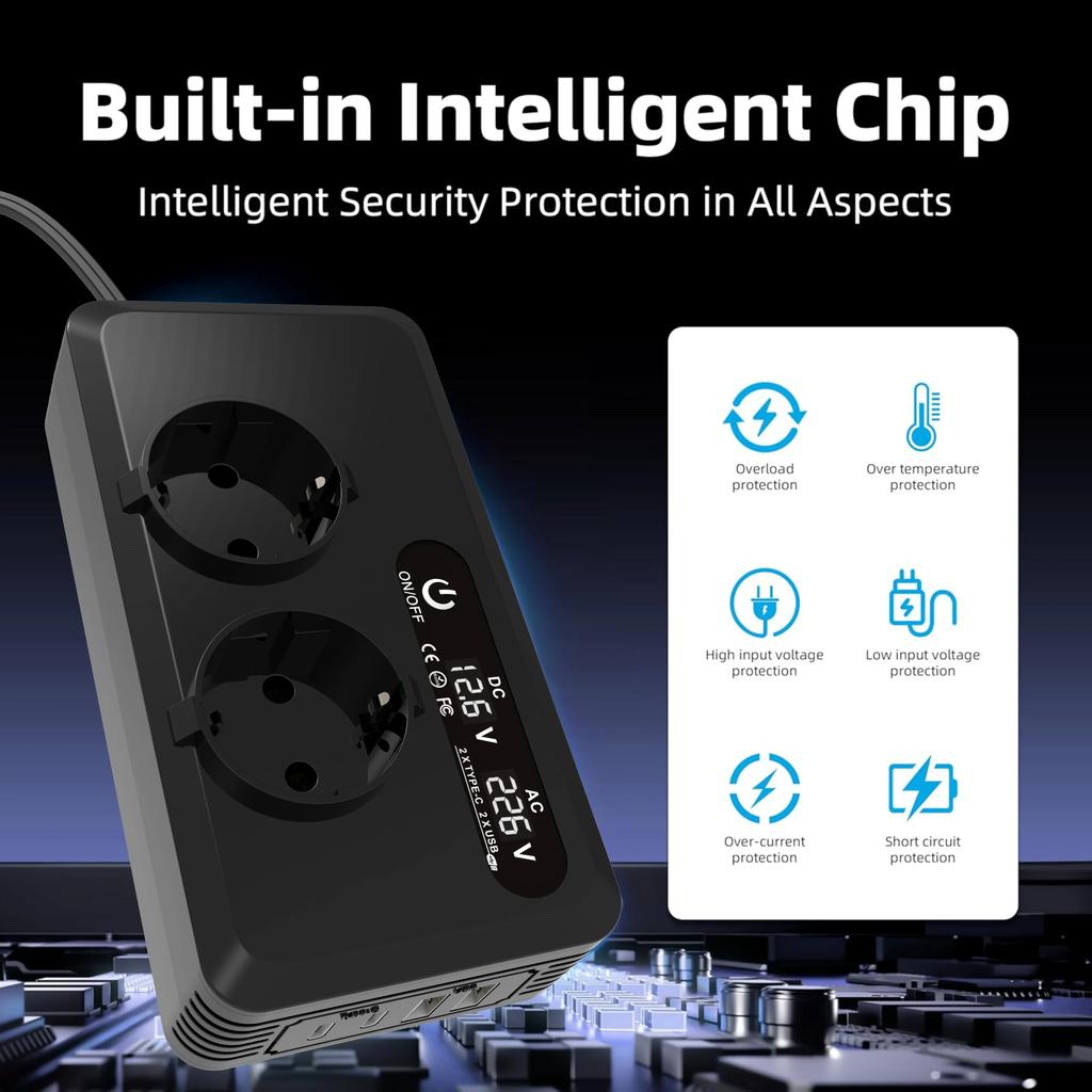 1. Эффективный автомобильный инвертор: Этот автомобильный инвертор питания обеспечивает до 200 Вт непрерывной мощности через две розетки переменного тока, преобразуя 12 В постоянного тока в 220 В/230 В переменного тока. Идеально для одновременной зарядки нескольких устройств, включая телефоны и ноутбуки, с использованием технологии автомобильного инвертора.