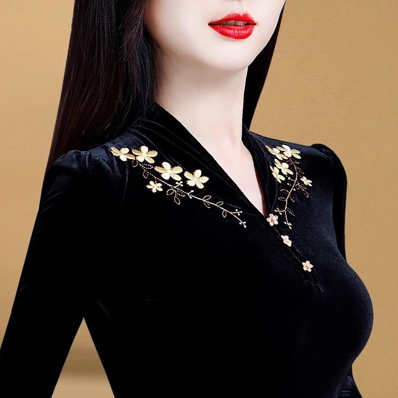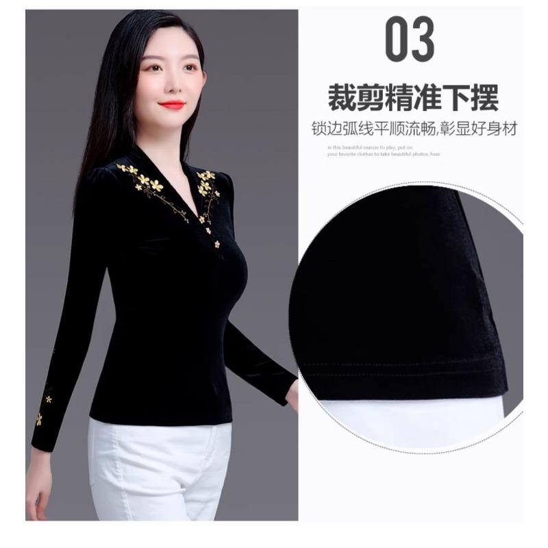 Бархатная Утепленная Базовая Футболка Черное Золото для Женщин Новая Осень и Зима Западный Стиль Внутренний Топ