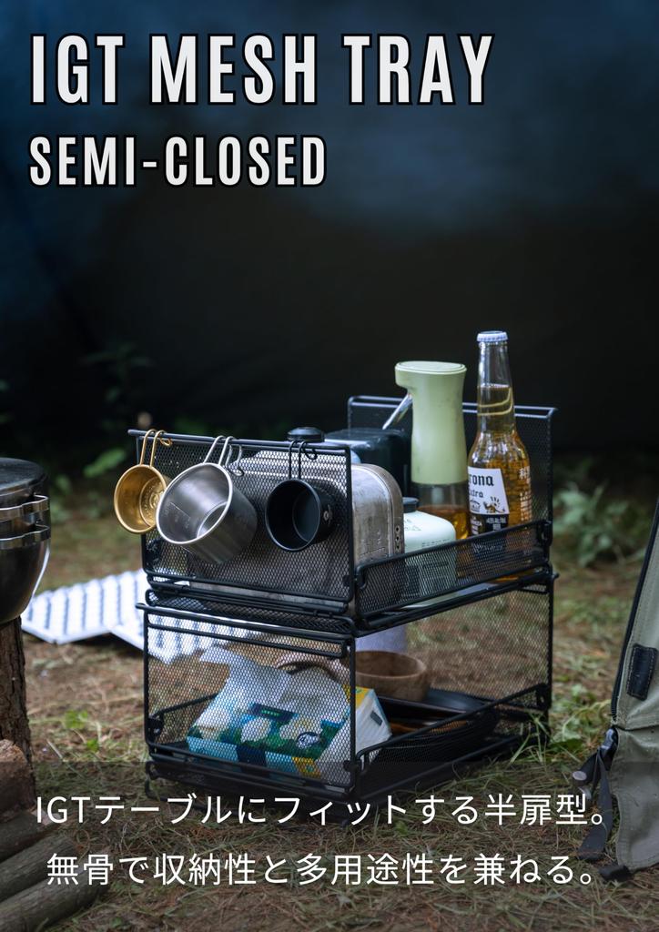 [Конструкция с полудверцей] Прочная конструкция из просечно-вытяжного листа подноса IGT гармонично вписывается в суровые условия окружающей среды, сочетая практичность и дизайн. Он также функционирует как штабелируемая полка для хранения, создавая простое и унифицированное пространство в вашем кемпинге.. Конструкция обеспечивает легкий доступ даже когда лоток вставлен в стол. Его также можно использовать перевернутым вверх дном в качестве стола или полки для дополнительной универсальности.
