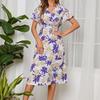 Women Floral Chiffon Casual Summer Dress V Neck Short Sleeve High Waist Swing Long Chic Sizes S To XL