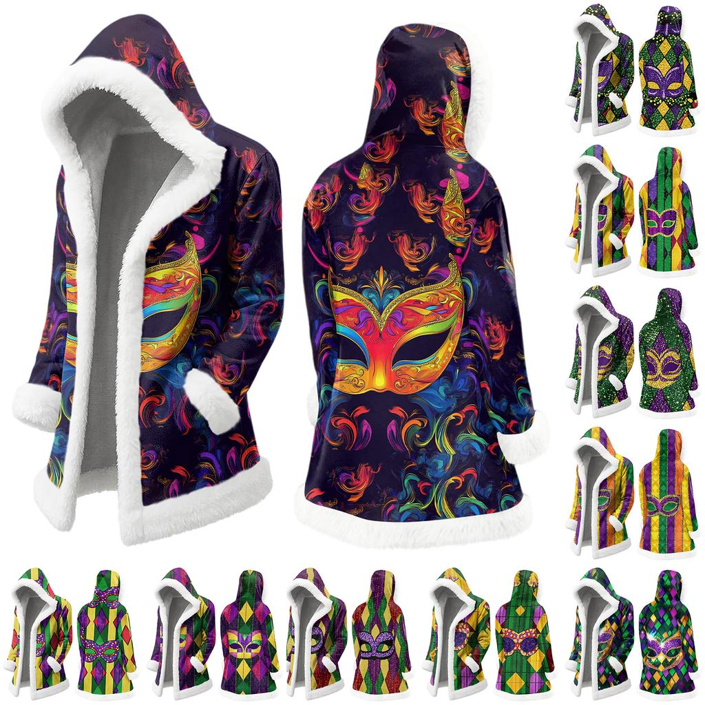 Унисекс Повседневная и Модная Куртка с Капюшоном и Длинными Рукавами с Плюшевым Воротником и Принтом Карнавала