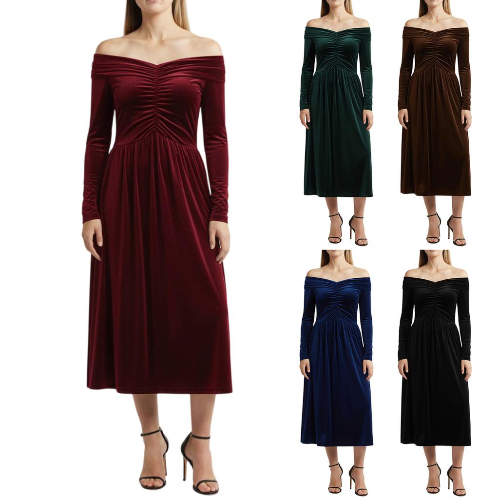 Женское модное повседневное бархатное платье однотонное элегантное с высокой талией облегающее с длинным рукавом с открытыми плечами длинное платье — купить товар онлайн с бесплатной доставкой по всему миру!