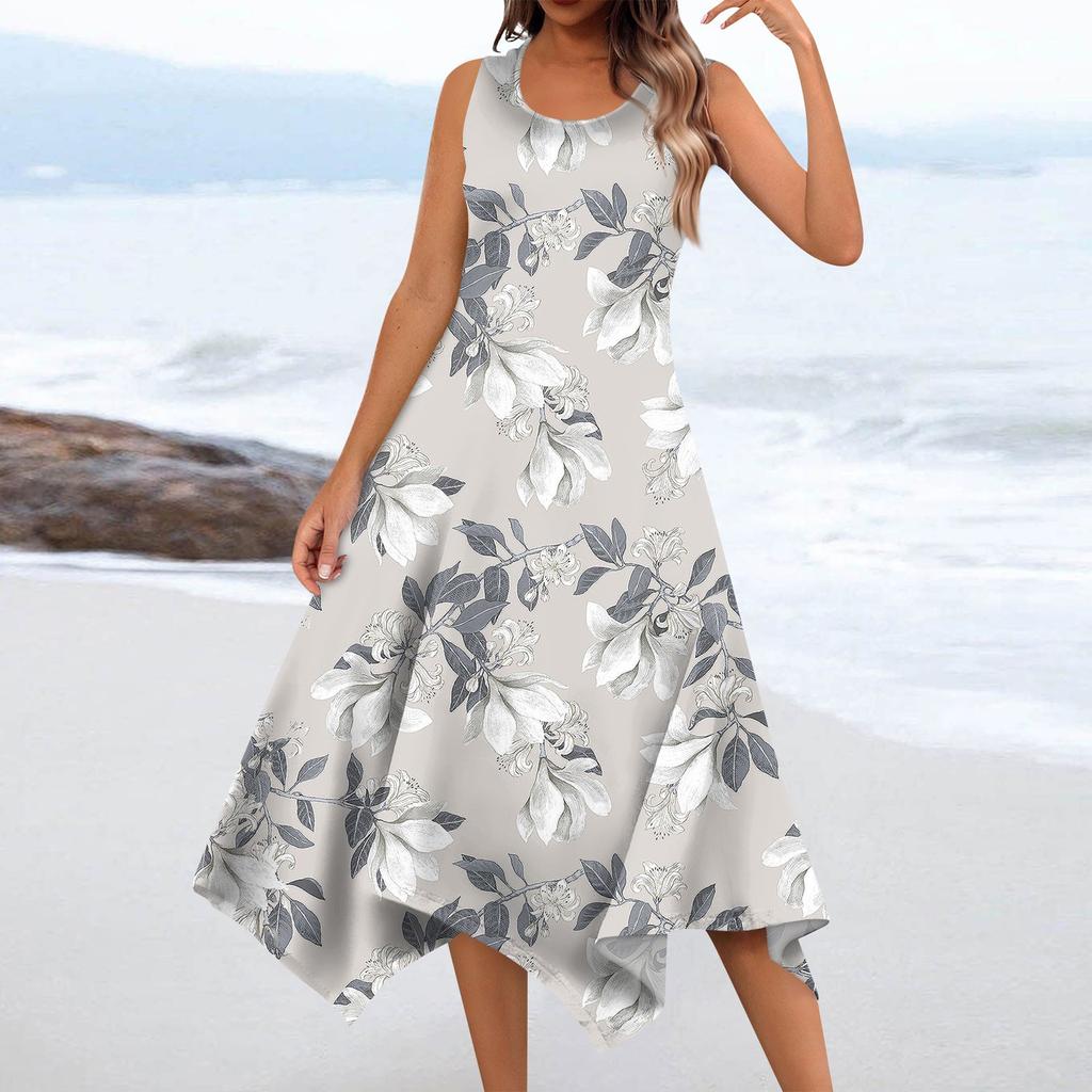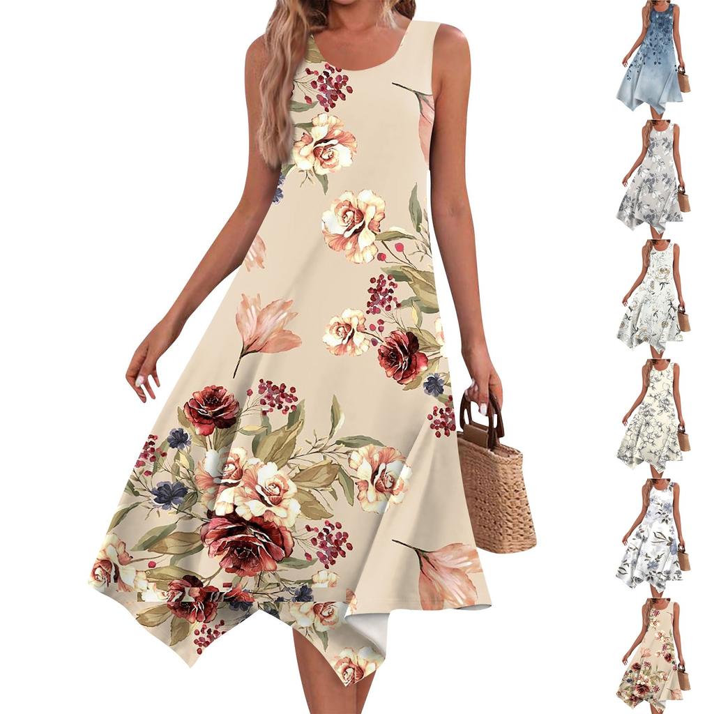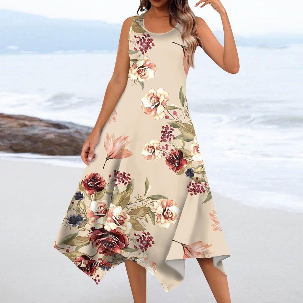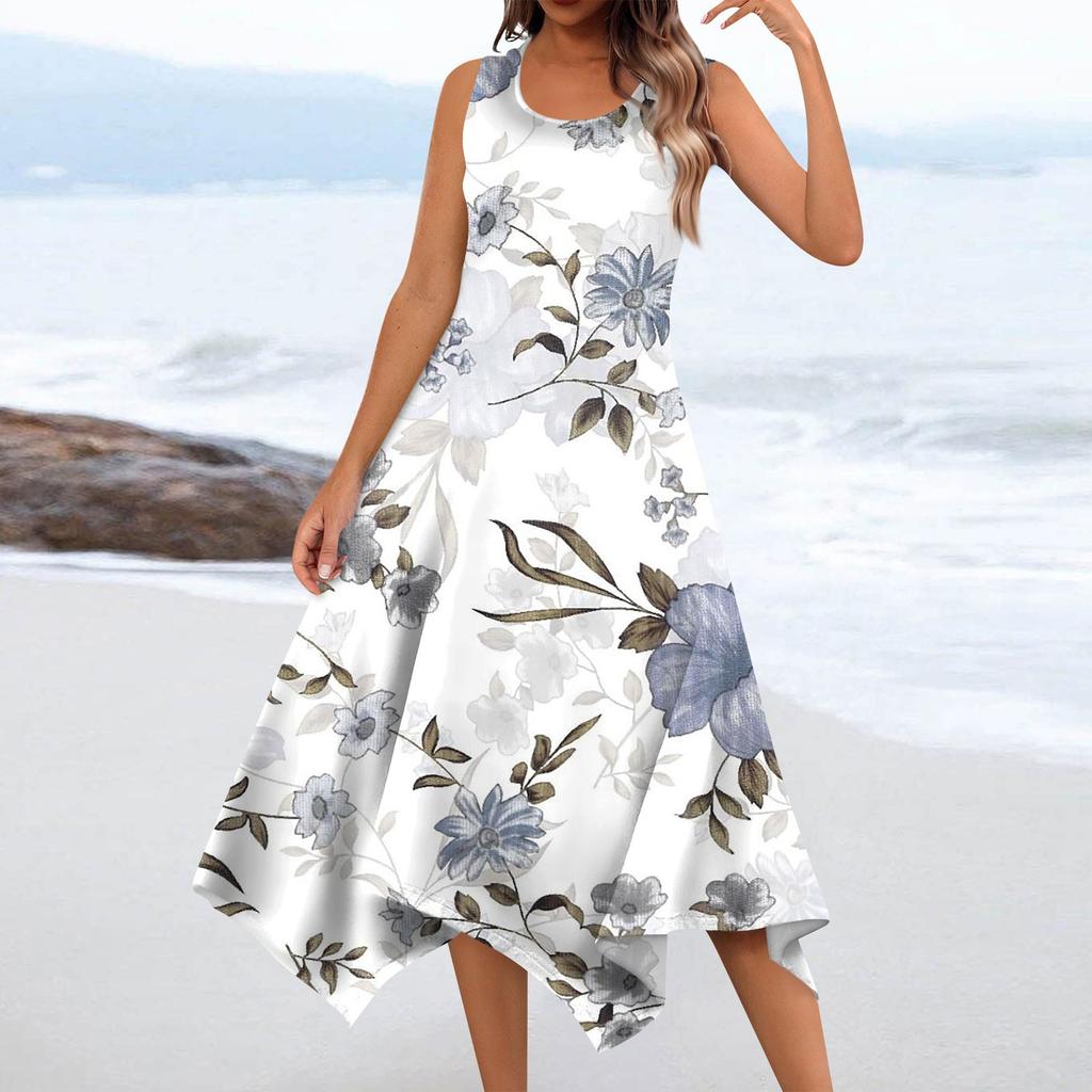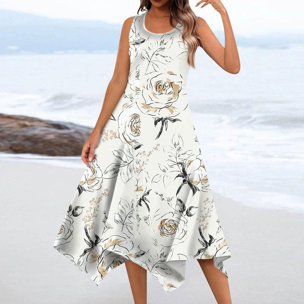 Женское повседневное модное платье миди без рукавов с круглым вырезом и цветочным принтом, нерегулярный подол