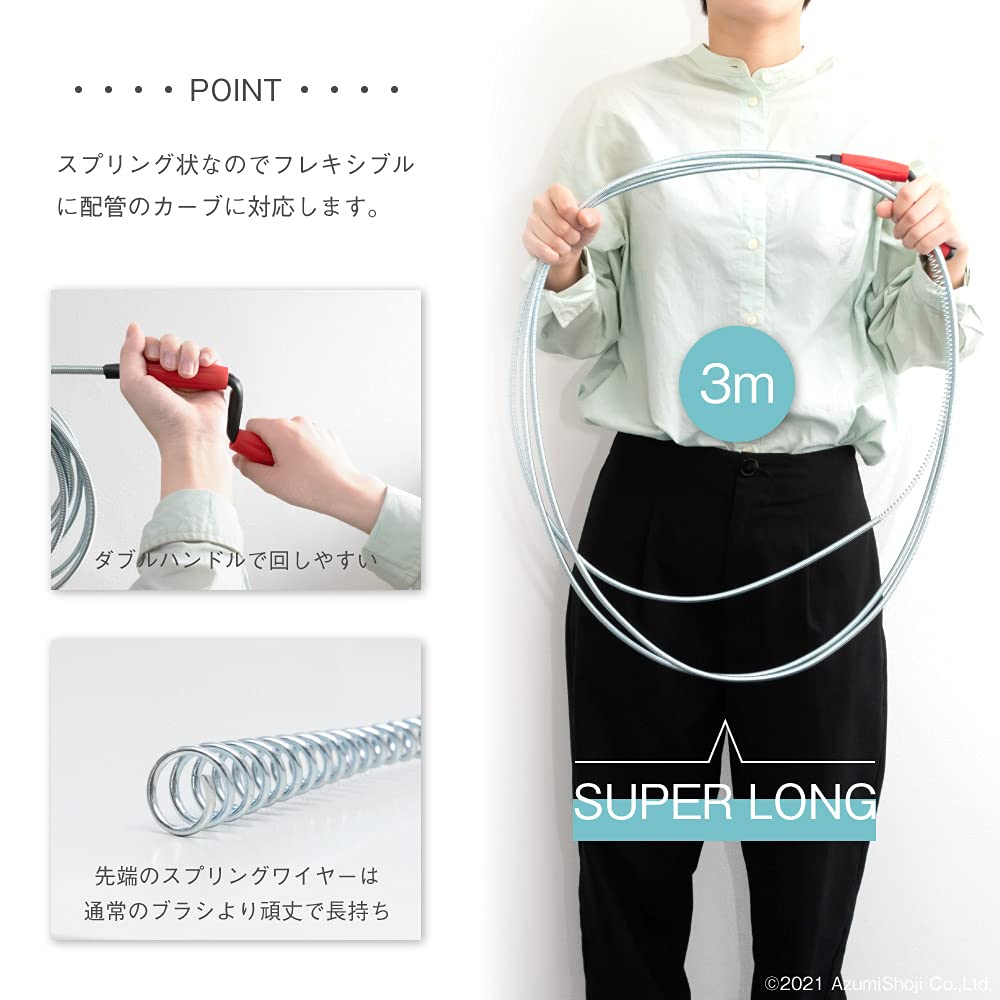 Anzumi Shoji Spring Wire Brush, 3 Meter, for Flush Pipe Cleaning, Toilets, Kitchen Drains, Bathrooms, and Gutters, Eliminates Clogs and Odors