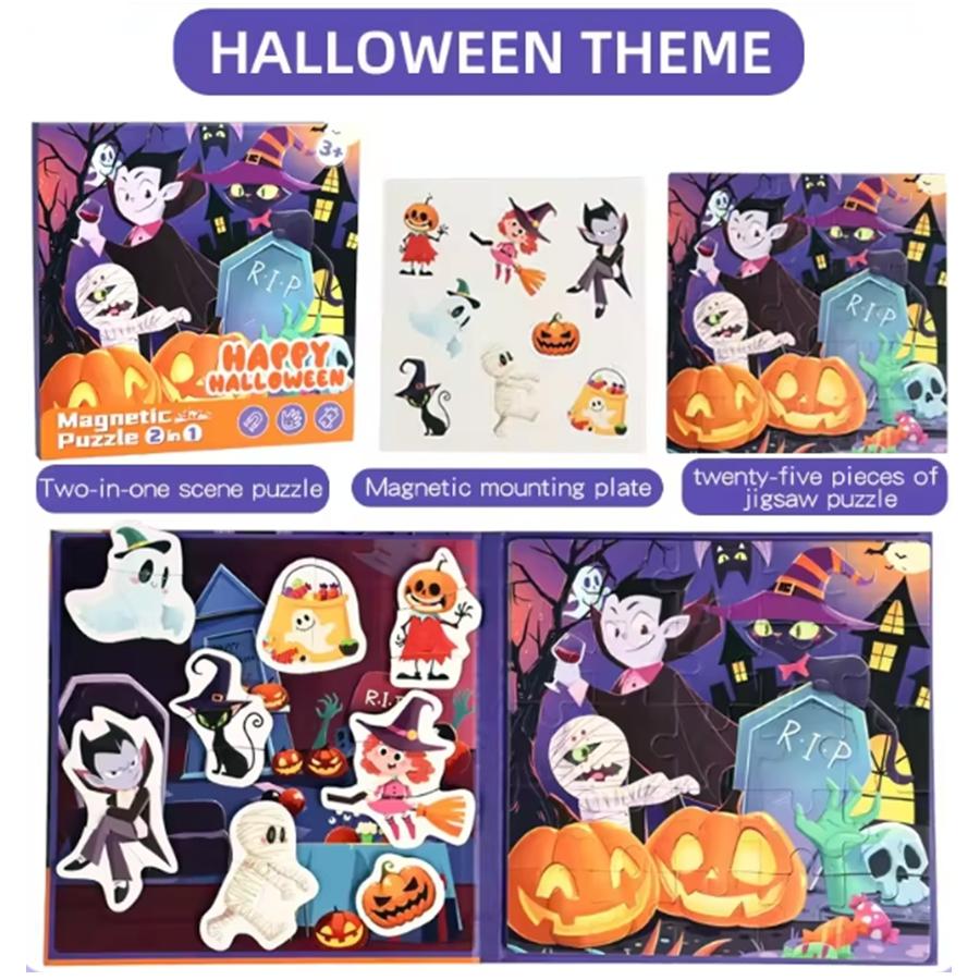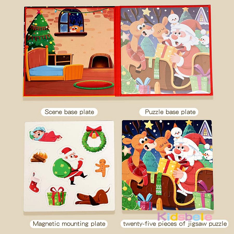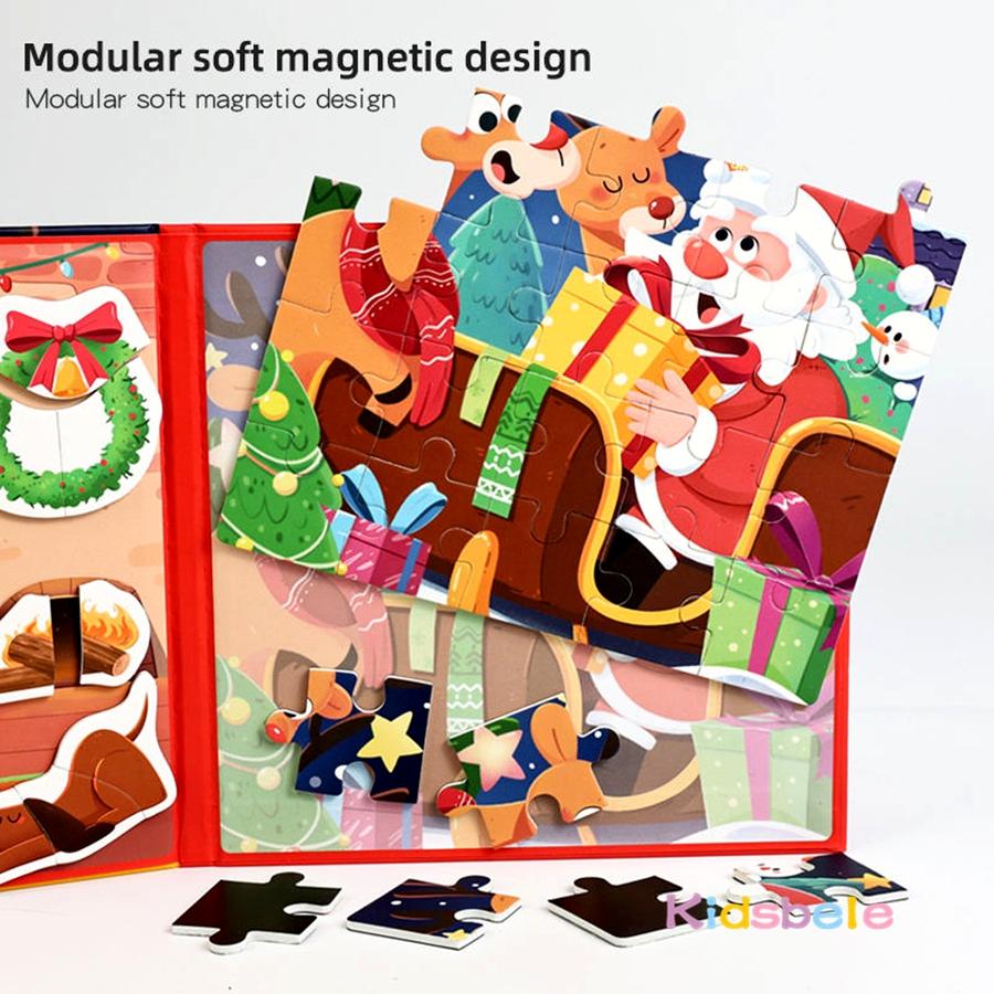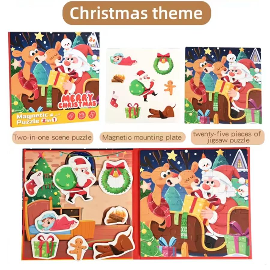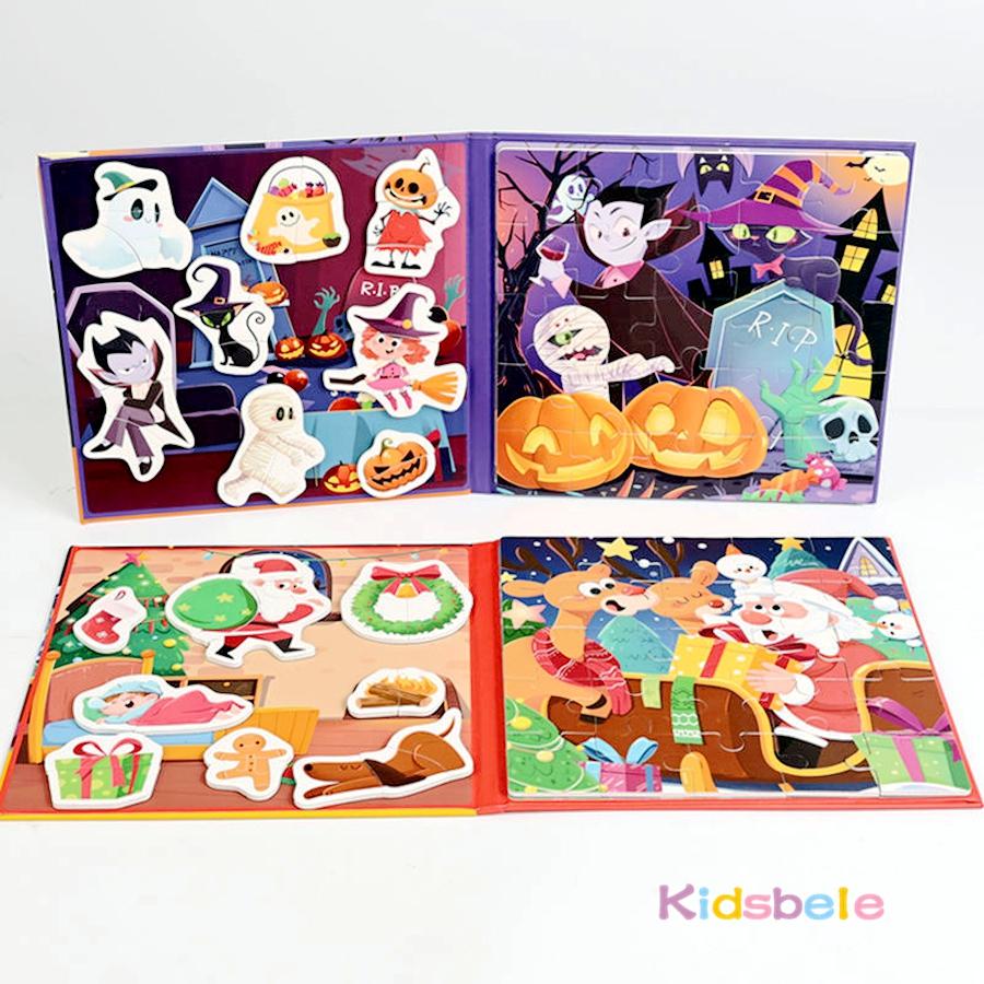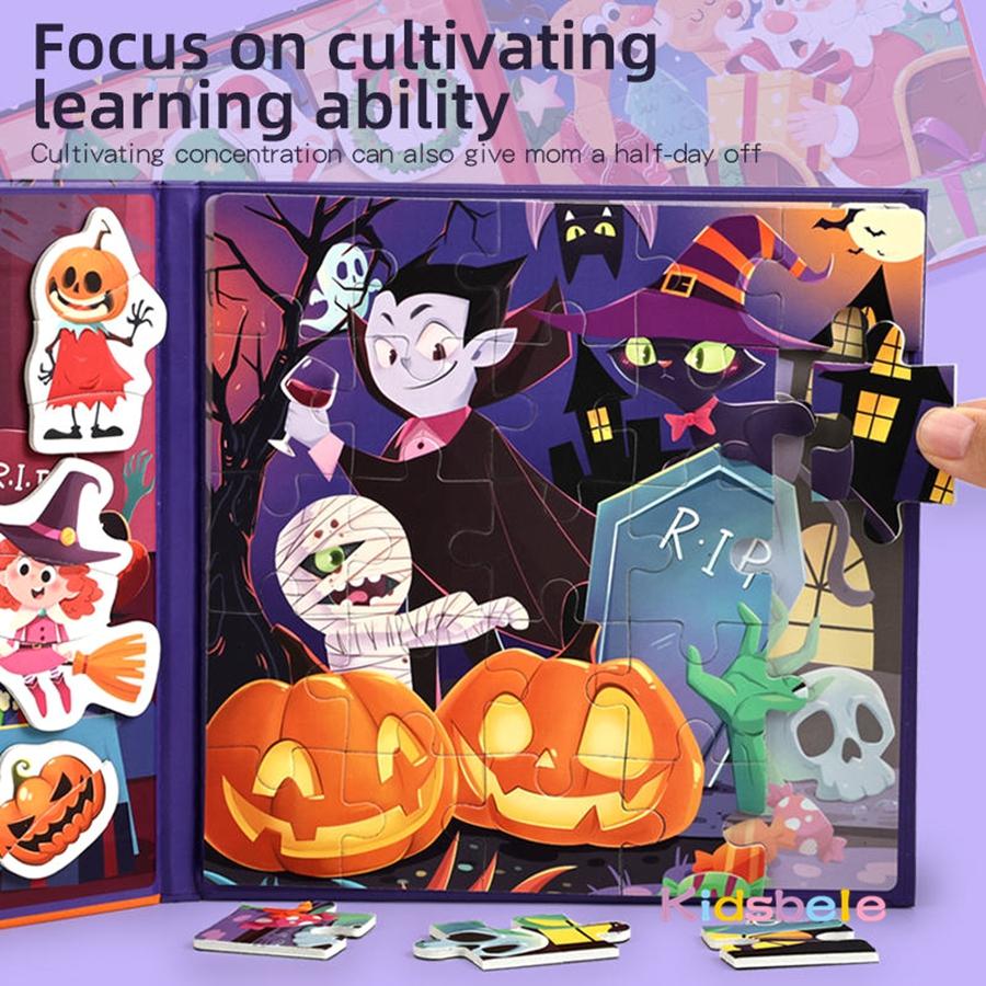 Magnetic Jigsaw Puzzles Portable Book Christmas/Halloween Sticker Book Montessori DIY Creative Holiday Themed Party Gift for Kid