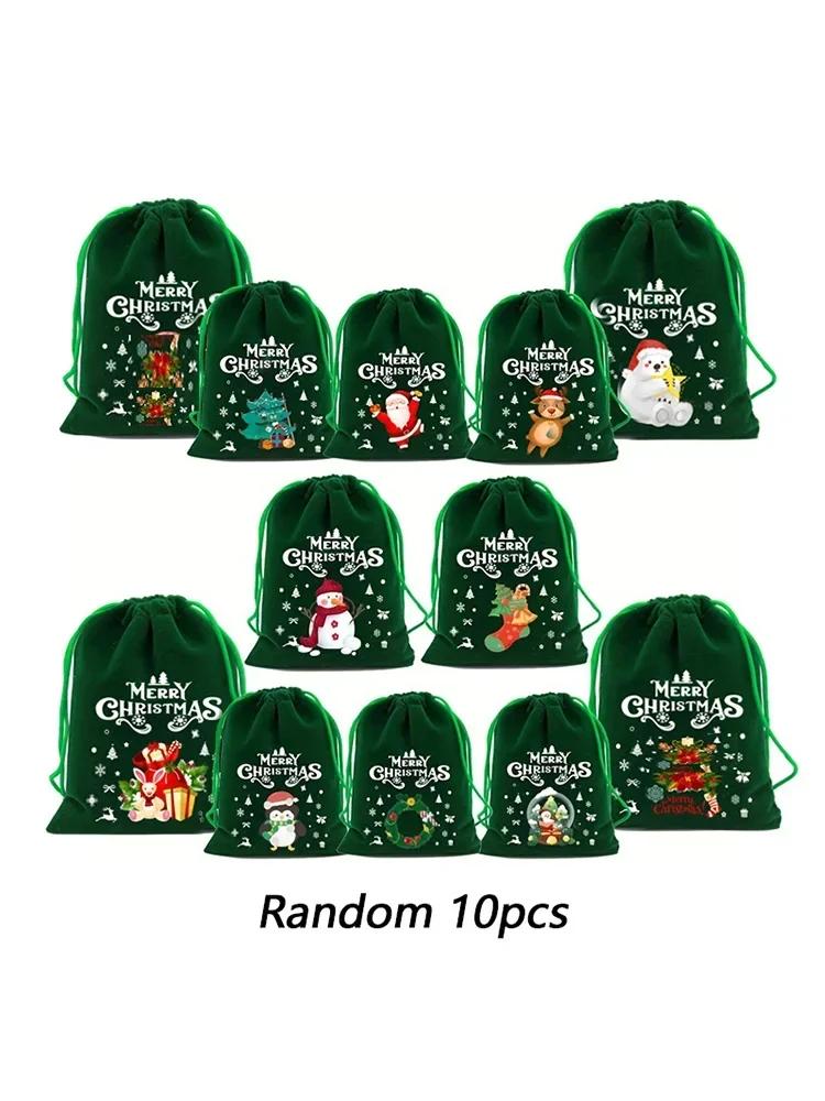 10 шт. Веселые рождественские бархатные сумки, зеленый мешочек с завязкой, подарочный пакет для конфет, упаковочные пакеты для ювелирных изделий, рождественские новогодние принадлежности для вечеринок