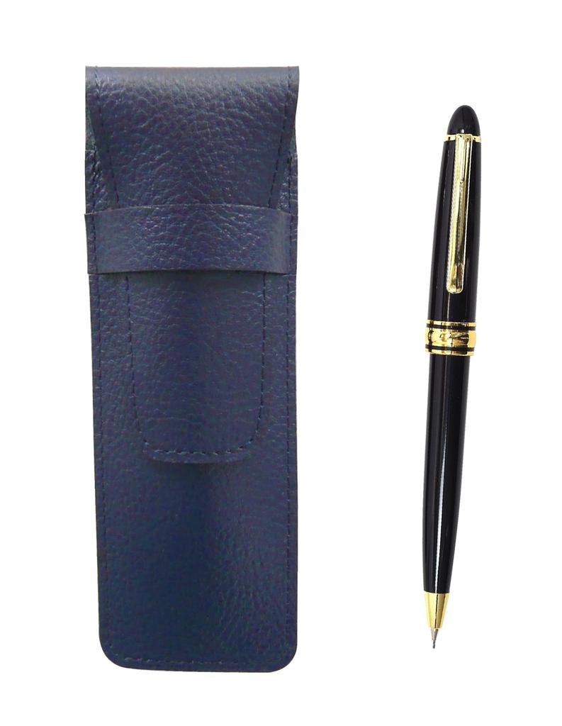 Blue grained leather pen case with metal ring cap and sliding retro mechanical pencil set SASL-8838S