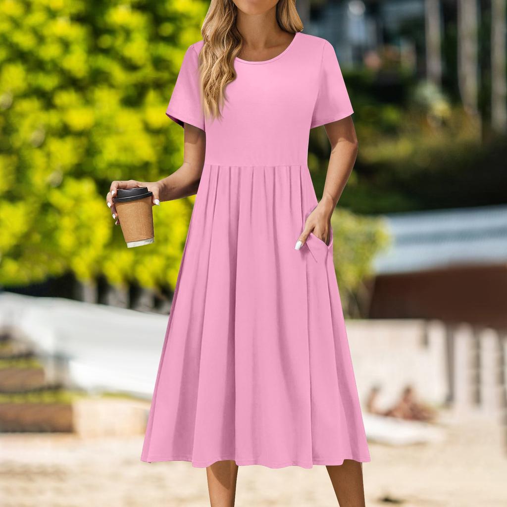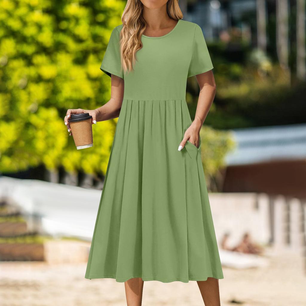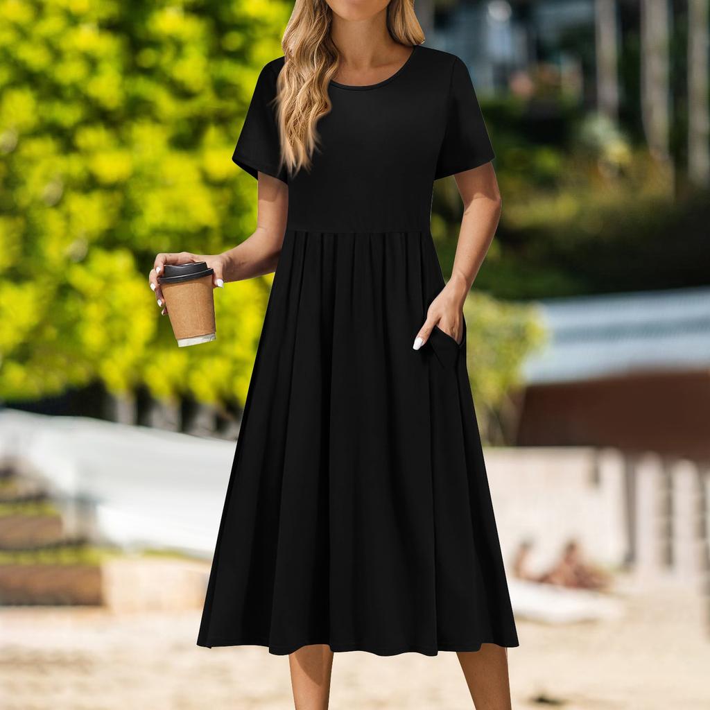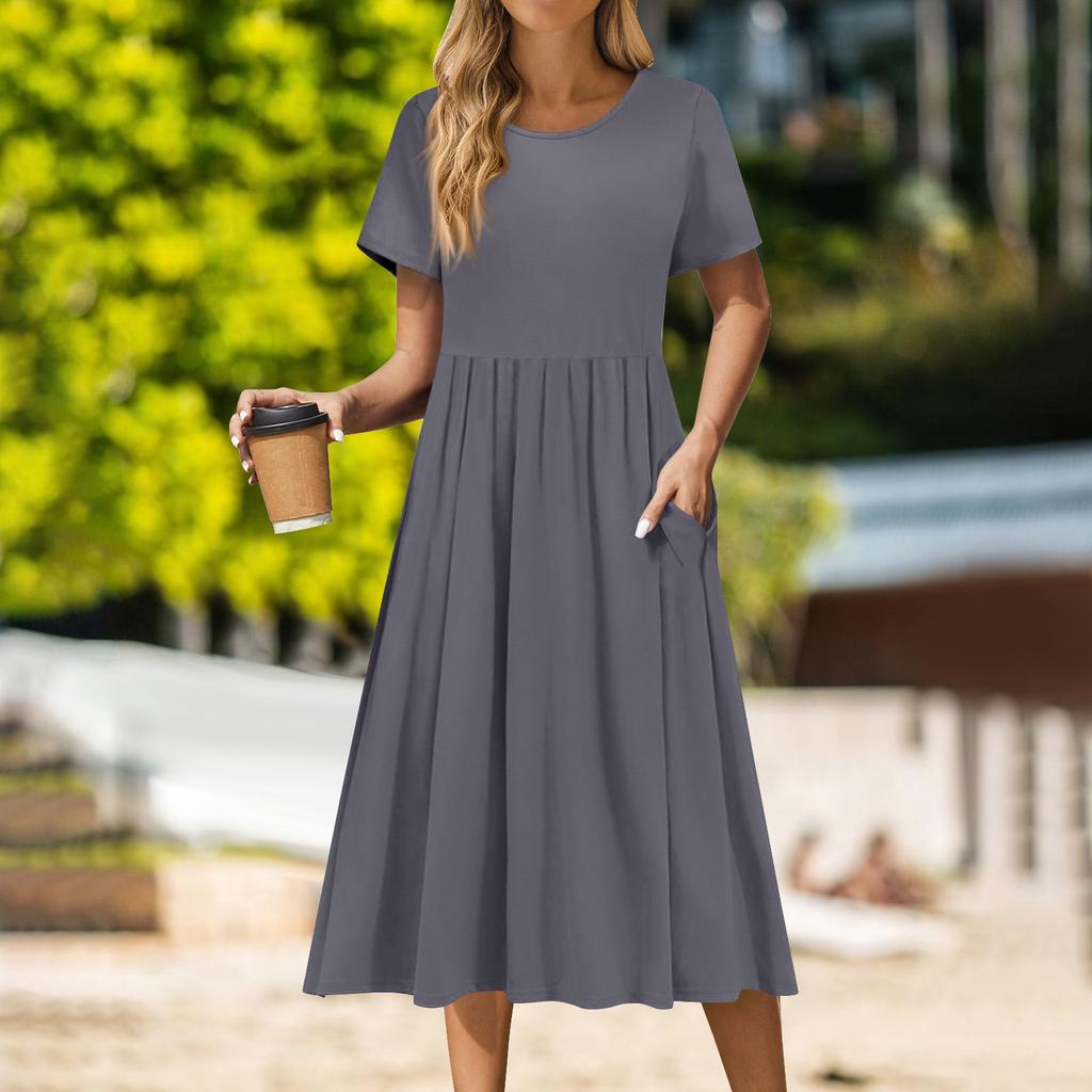 Женское повседневное платье миди с круглым вырезом, классическое повседневное платье с коротким рукавом свободного кроя