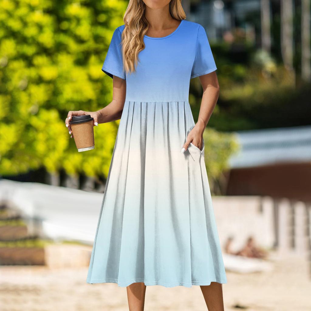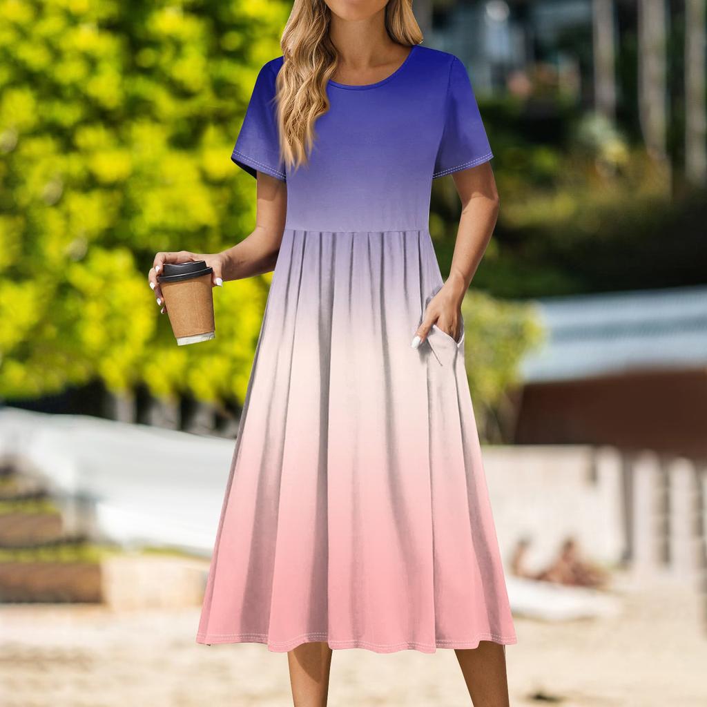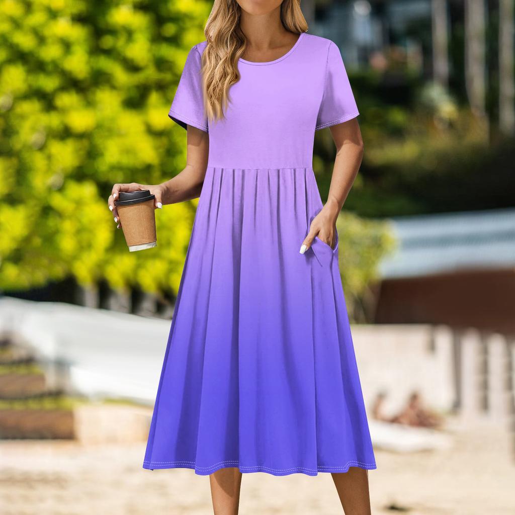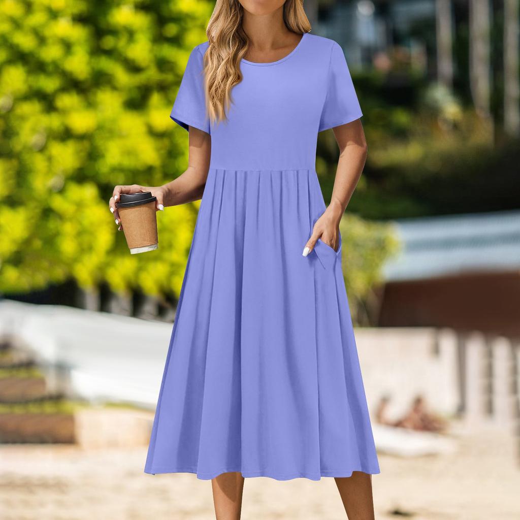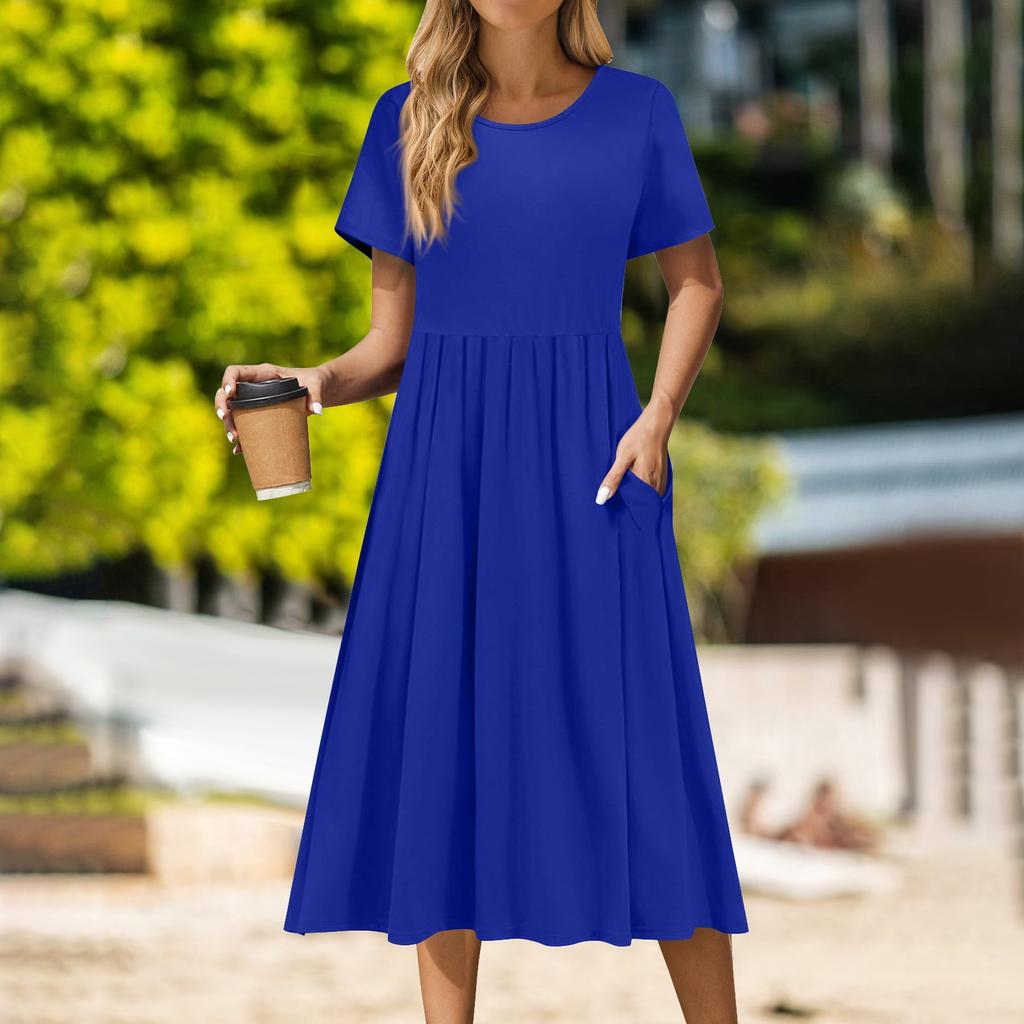 Женское повседневное платье миди с круглым вырезом, классическое повседневное платье с коротким рукавом свободного кроя