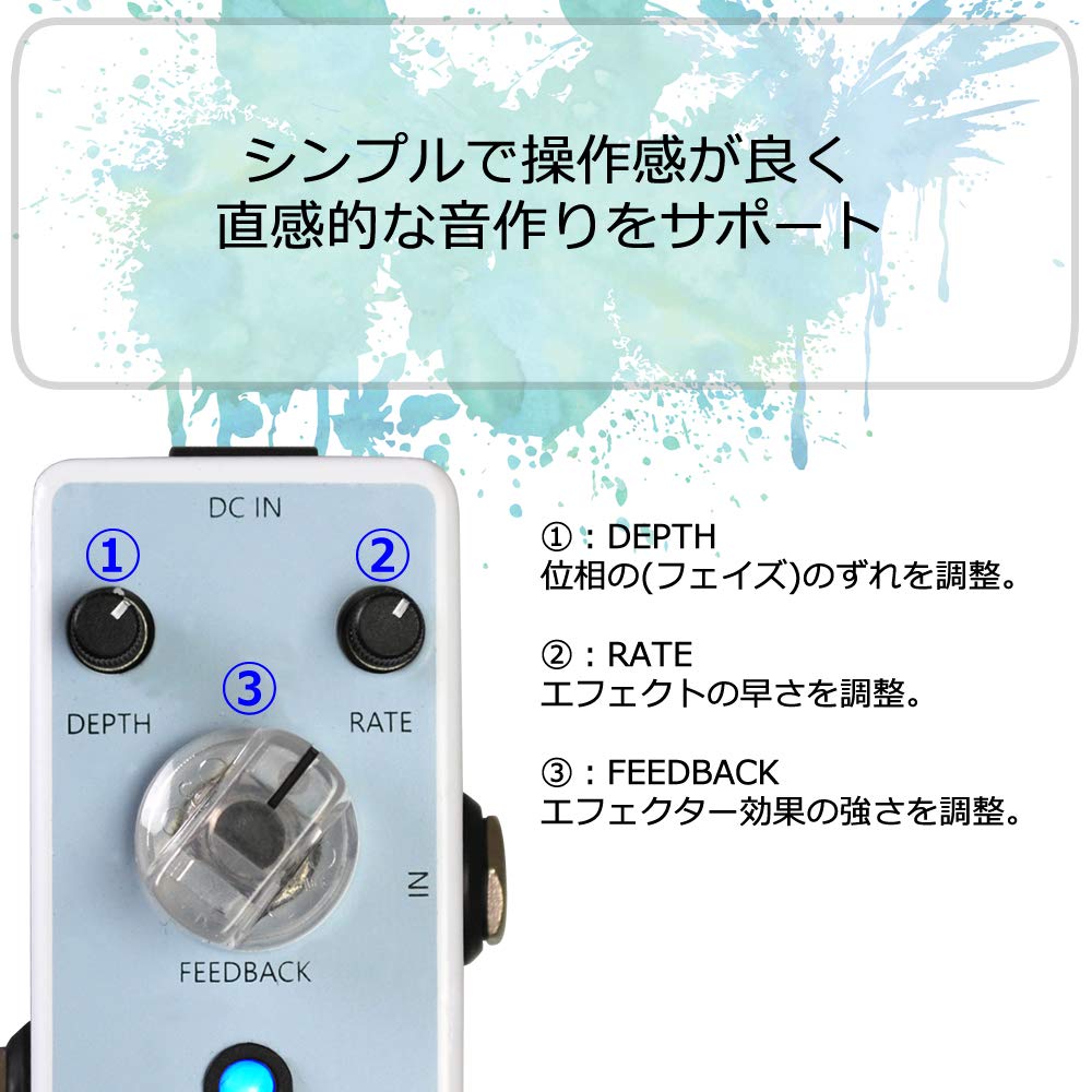 Используйте ручки DEPTH и RATE для точной настройки глубины и задержки звука эффекта, а ручка FEEDBACK регулирует уникальный тон PHASER.
