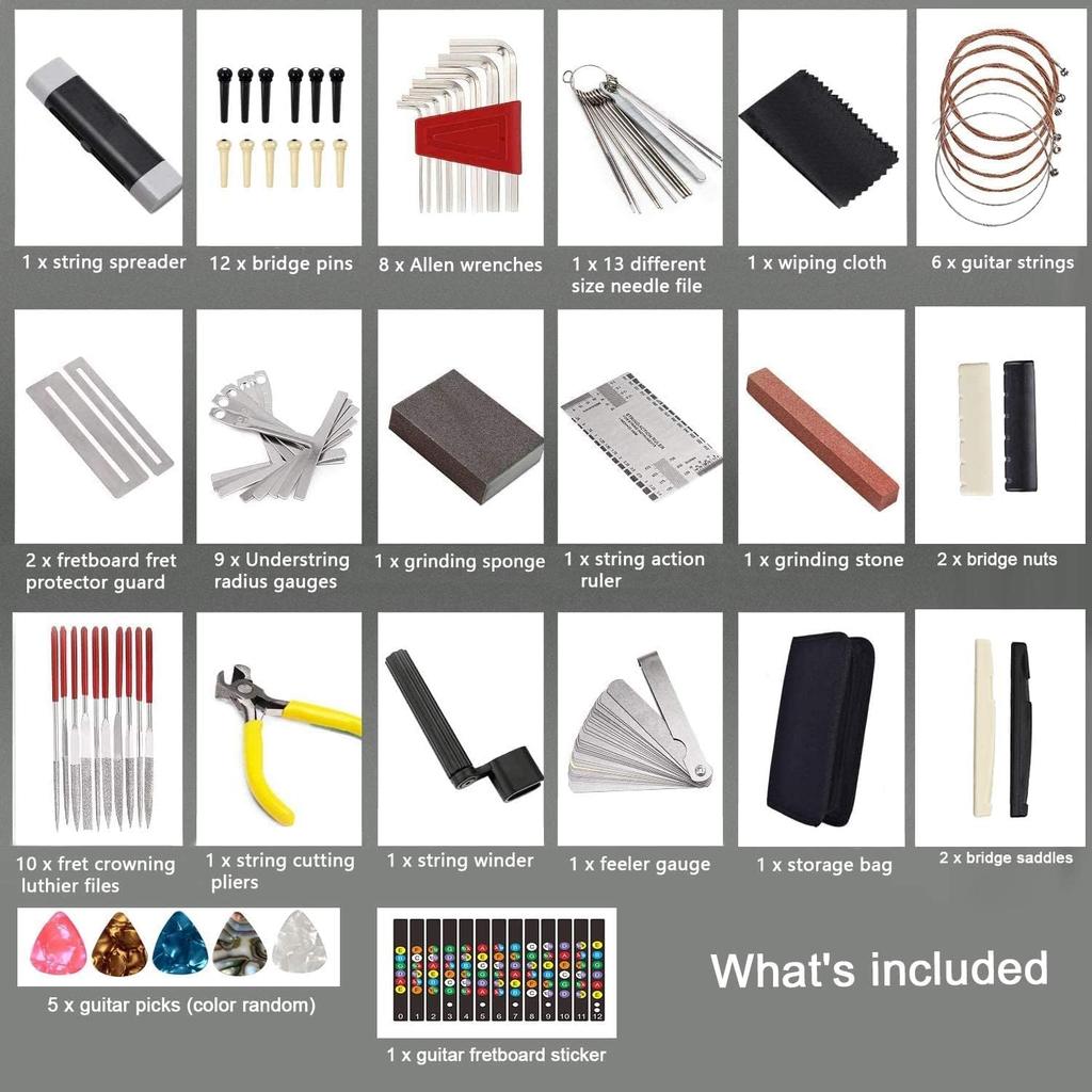 3. Parts Replacement & Customization Nut Replacement: Optimize string passage with 13 nut files and 2 replacement guitar nuts. Saddle Replacement: Replace worn parts with 2 spare bridge saddles. String Awning Replacement: Includes 12 acoustic guitar pins for repairs or customization.