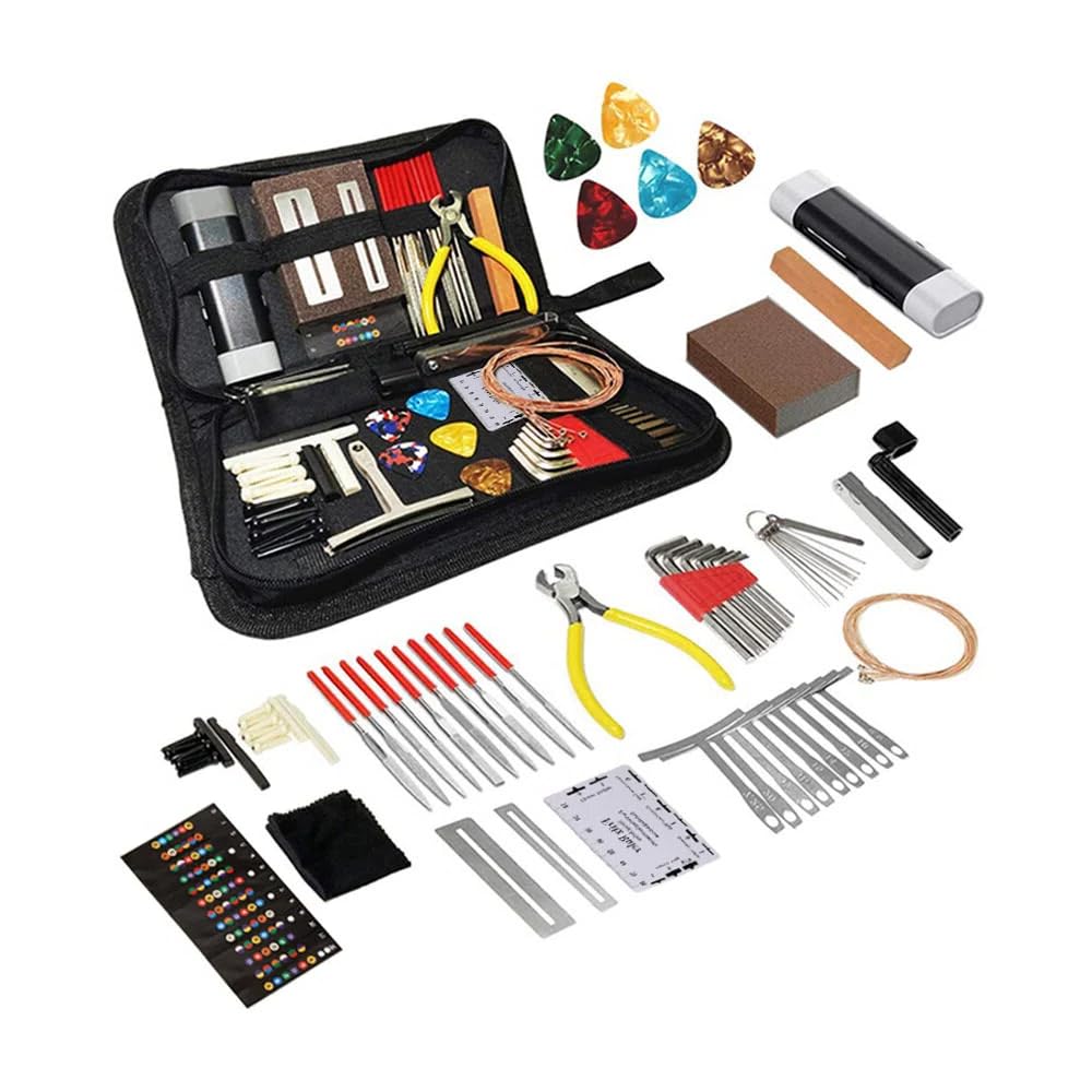 4. Daily Cleaning & Care Rust Removal: Remove rust from metal parts with the dedicated rust removal tool. Fingerboard Protection: Protect the fingerboard from scratches while working with the guards. Finishing Cleaning: Wipe away tool marks and fingerprints with the cloth. [Set contents list] Main tools: Fret pliers, string winder, pen-type tool Hex wrench set (8 sizes), needle file set Diamond file, fret sanding/polishing stone Feeler gauge, string height gauge, fingerboard radius gauge (10 types) Ruler, polishing sponge (240 grid) Replacement parts & consumables: Guitar nuts (2 pcs), bridge saddles (2 pcs) Guitar pins (12 pcs), guitar strings (set of 6) Nut files (13 types), protective guards (2 pcs) Guitar picks (10 pcs), cloth (1 pc) Accessories: Practice guitar fretboard sticker (1 pc), storage bag (1 pc) Total: 72-piece set [Especially recommended for] Those who want to keep their guitar in perfect condition themselves Those who want to restore or customize used guitars