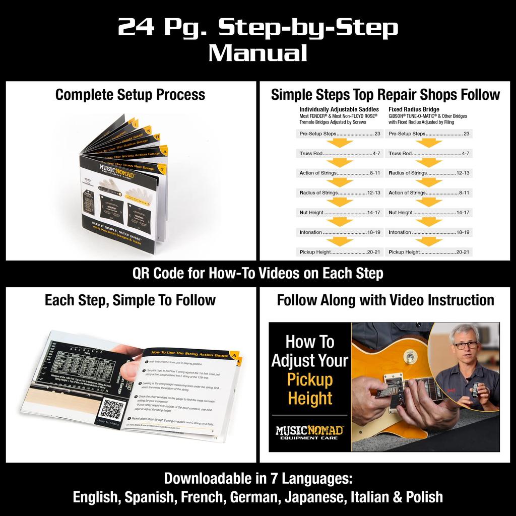 The string height gauge features an innovative black finish and deeply engraved white markings for accurate readings.