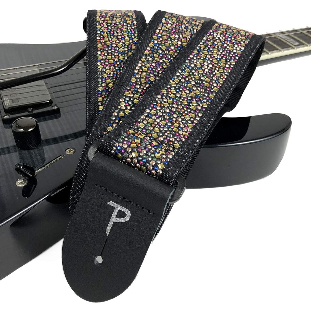 These 2-inch (5.1cm) wide jacquard guitar slaps feature a colorful rhinestone design.
