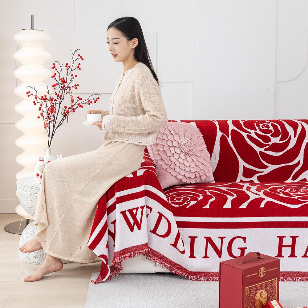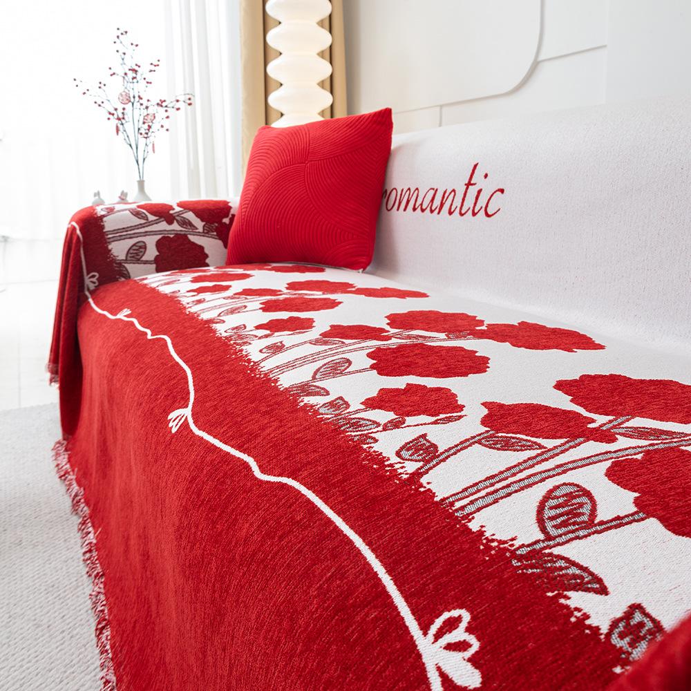 Красное полотенце для дивана в китайском стиле. У моей семьи есть чехол для дивана из шенилла, который подходит для любого сезона, и покрывало для дивана с изображением букета роз.