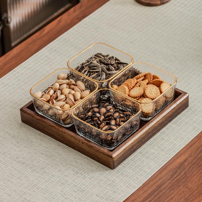 Walnut Wood & Glass Four-Compartment Fruit Serving Set