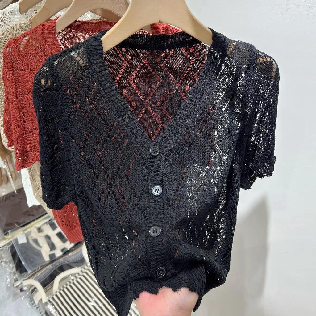 Женская летняя тонкая футболка с V-образным вырезом, простой полый свитер из ледяного шелка