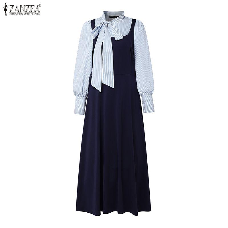 ZANZEA Женское повседневное элегантное длинное платье с полосатой вставкой и длинными рукавами
