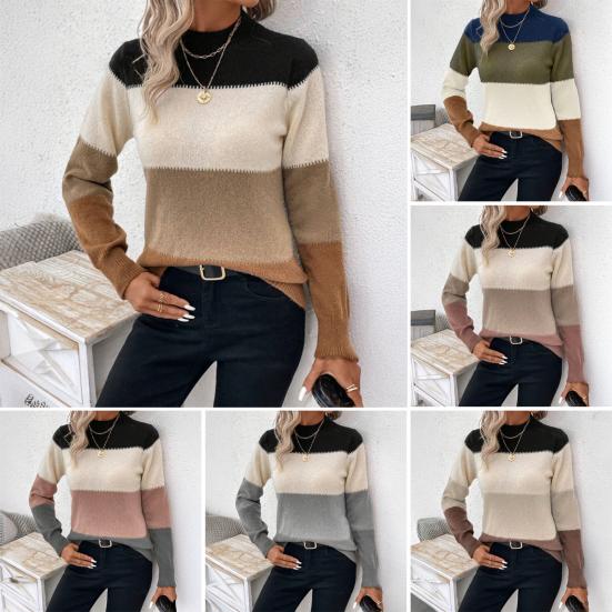 Стильный дизайн с цветными блоками и круглым вырезом: Свитер демонстрирует современный вязаный узор в стиле колор-блок в сочетании с классическим круглым вырезом.. Это сочетание простоты и стиля делает его привлекательным предметом, подходящим как для повседневной, так и для полуформальной обстановки.