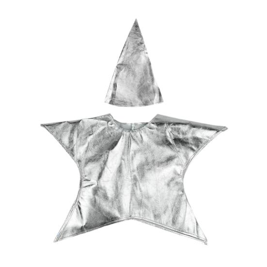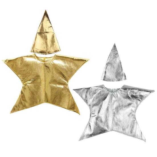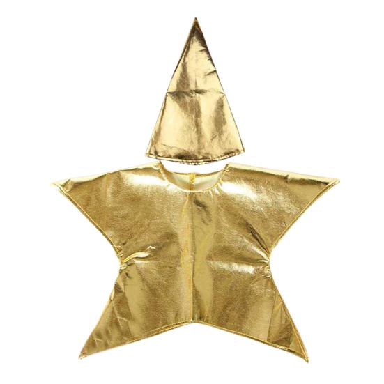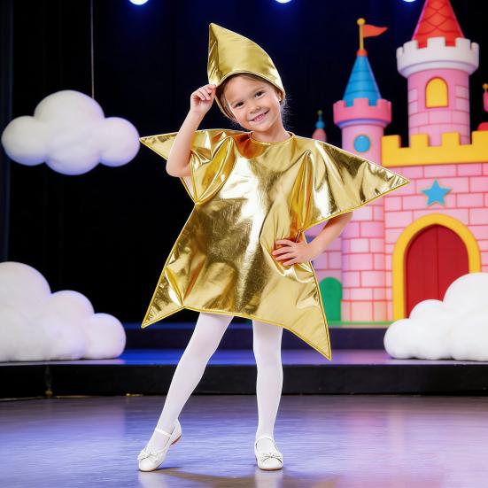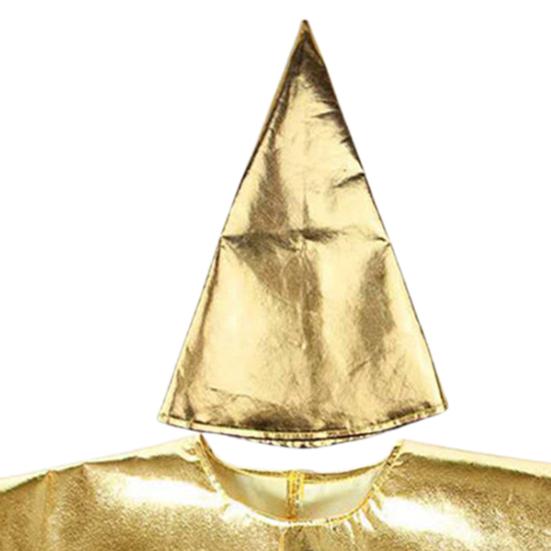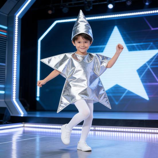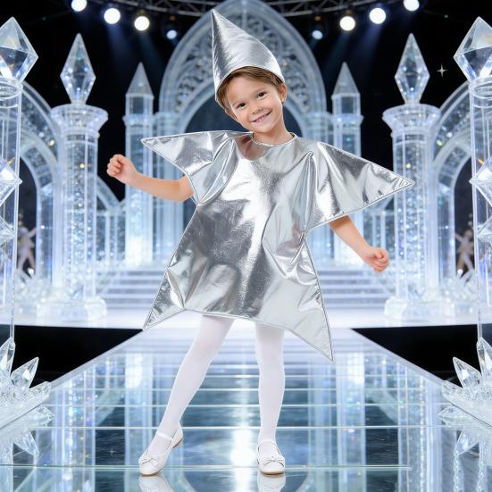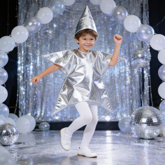 Этот костюм звезды изготовлен из блестящей, светоотражающей ткани, которая улавливает свет с металлическим блеском, делая вашего ребенка центром внимания на сцене.. Благодаря уникальной форме пятиконечной звезды и подходящему коническому капюшону, он создает завершенный и праздничный образ, который украсит любое выступление или тематическую вечеринку..