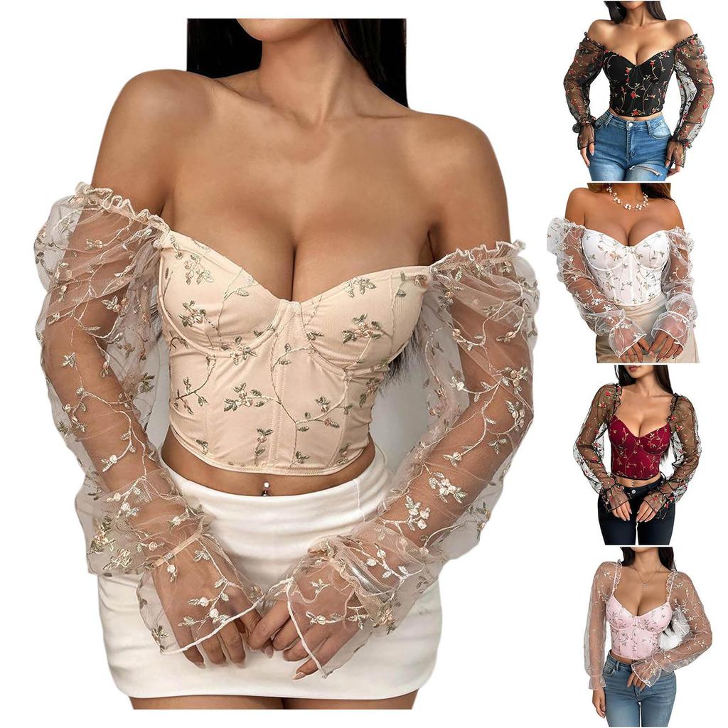 Женские топы-корсеты с открытыми плечами, модные сетчатые кроп-топы с длинными рукавами и цветочной вышивкой — купить товар онлайн с бесплатной доставкой по всему миру!