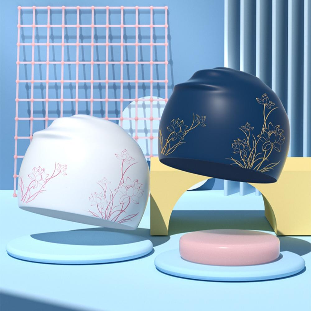 Женская силиконовая шапочка для плавания с узором лотоса, водонепроницаемая, не рвущаяся, подходит для длинных волос, с защитой ушей, из мягкого материала