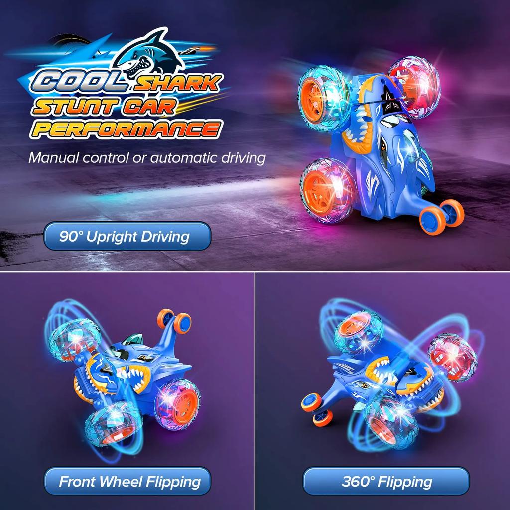 Remote Control Stunt Car 360° Flip Toy for Boy RC Car 4WD Cartoon Shark with Light Rotation Off Road Drift 2.4G Kid Toy Gift