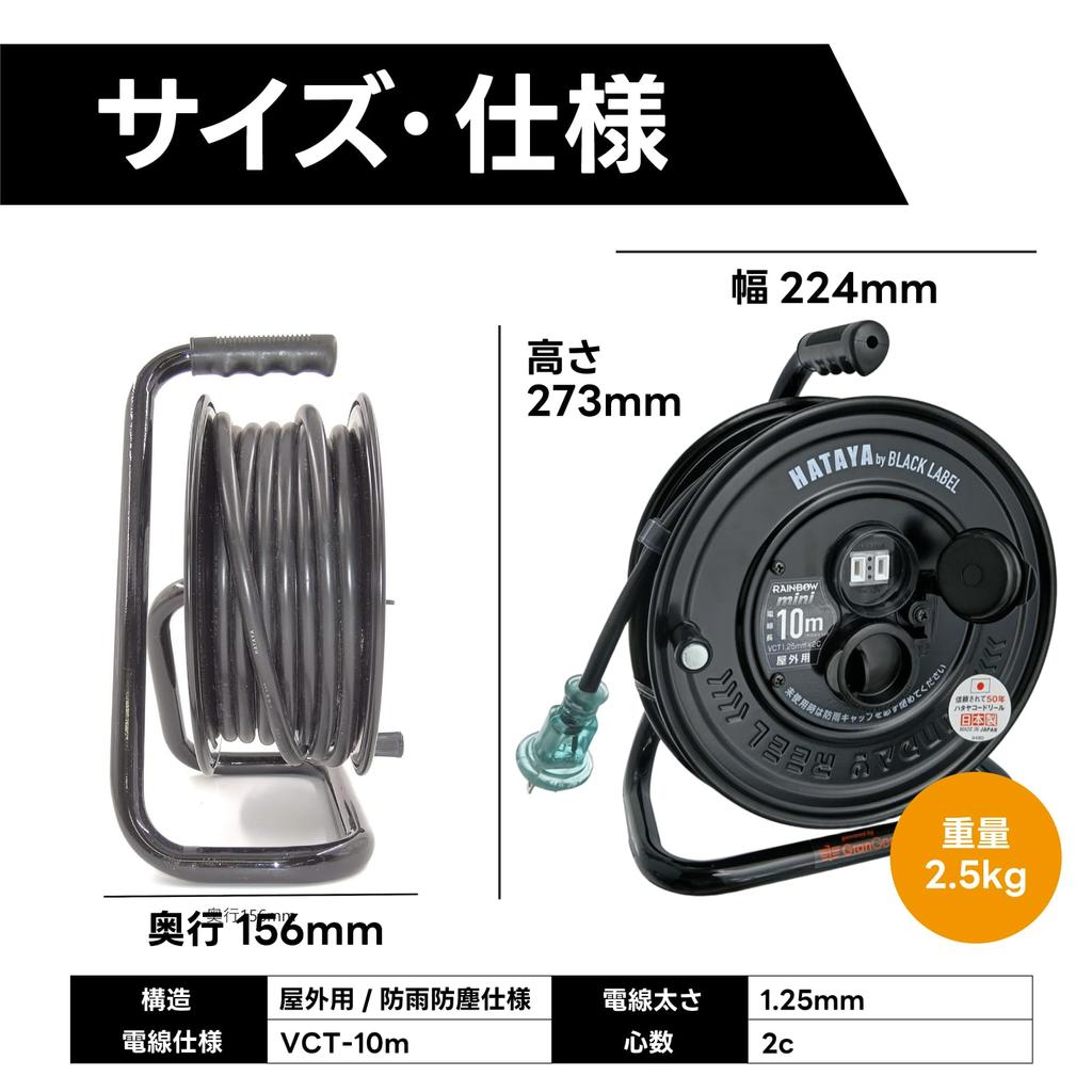 HATAYA Sunday Rainbow Mini 10m Cord Reel, Outdoor Rainproof (SS-10 Black Finish), HATAYA x GranGear Collaboration Product, Black