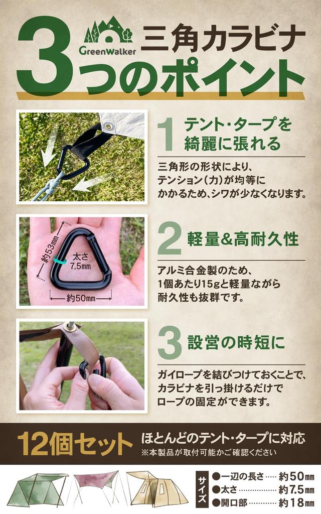 GreenWalker Triangular Carabiners for Tarps, Tents, Ropes, Camping, and Outdoor Use (Pack of 12) - Tested in Japan