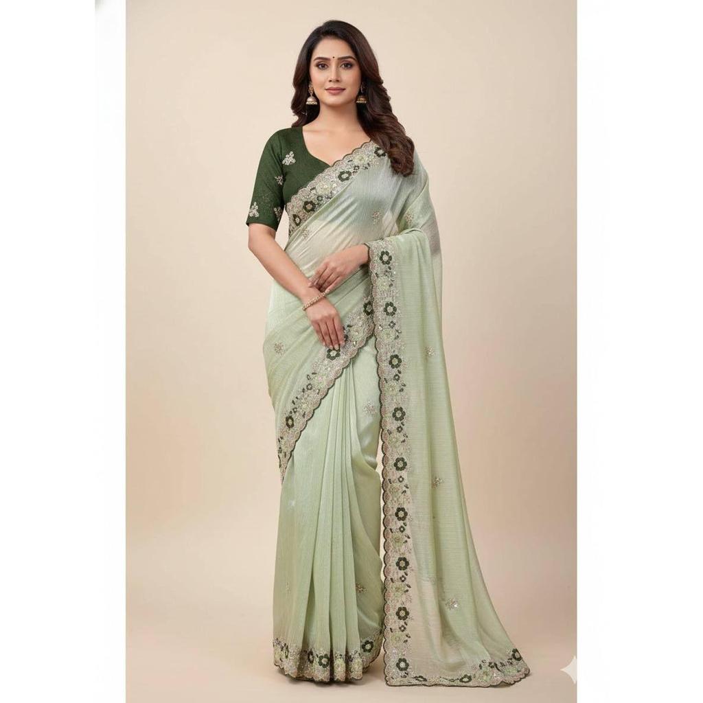 2)Ткань сари :Премиальный шифон с вышивкой паллу c и многониточной вышивкой с каймой, выполненной в технике арко.