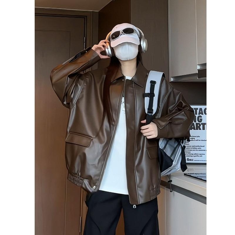 Ретро Гонконгский Стиль Мотоциклетная Коричневая Куртка из ПУ Кожи Мужская Ранняя Осень Новая Повседневная Свободная и Универсальная Верхняя Одежда