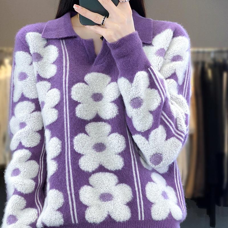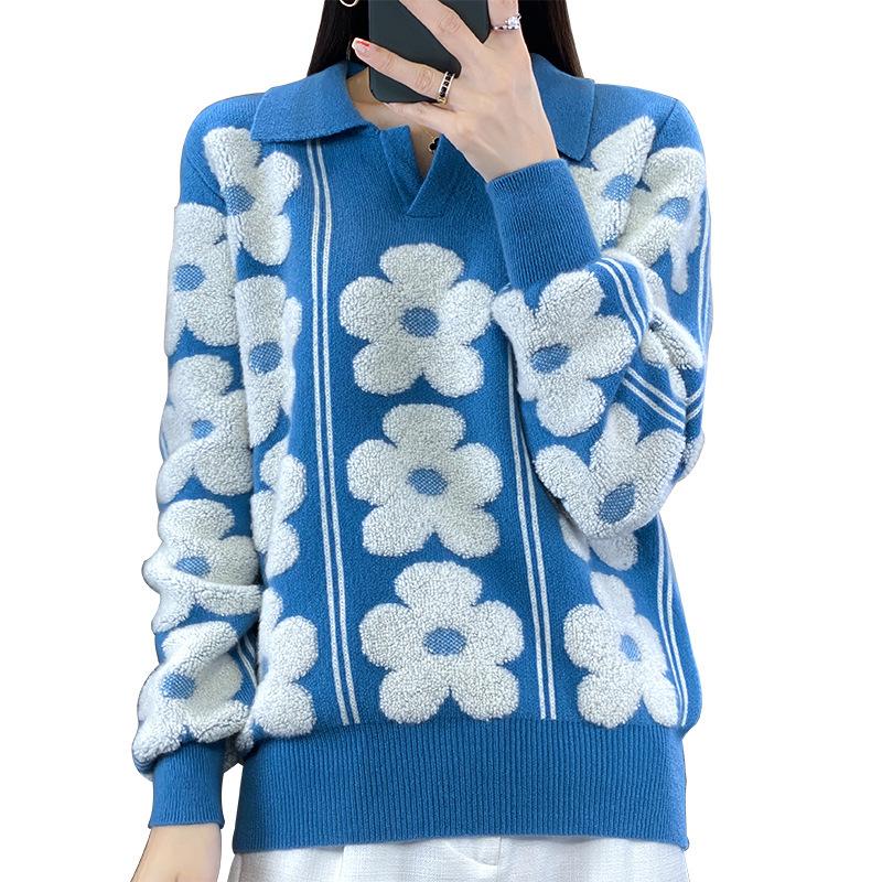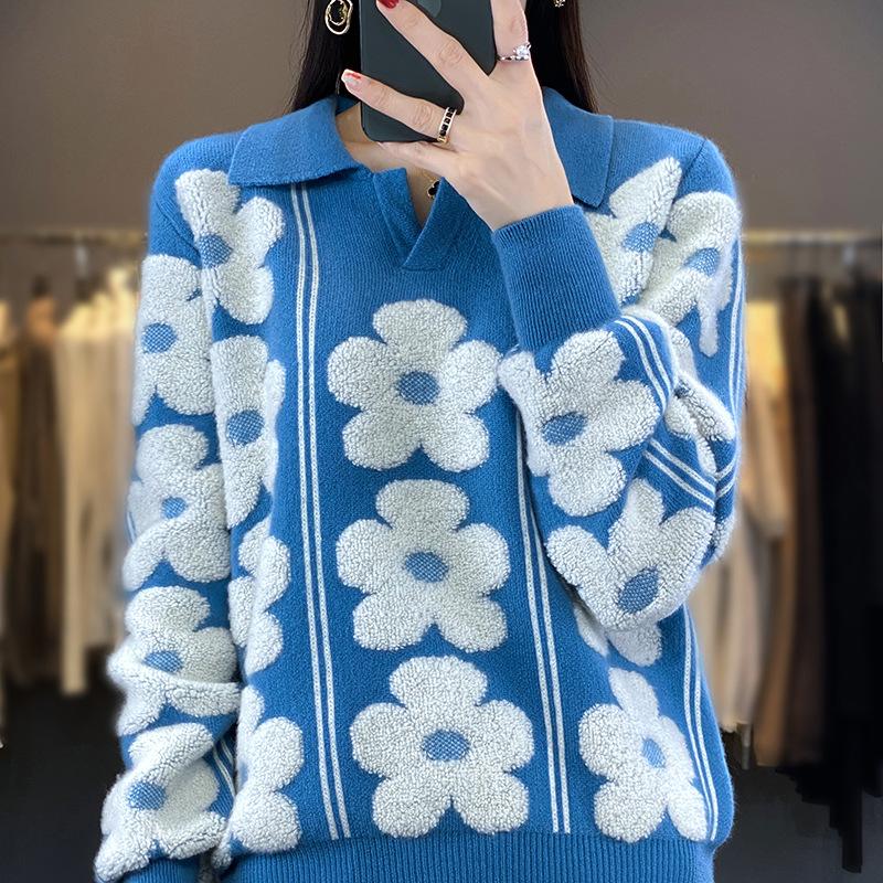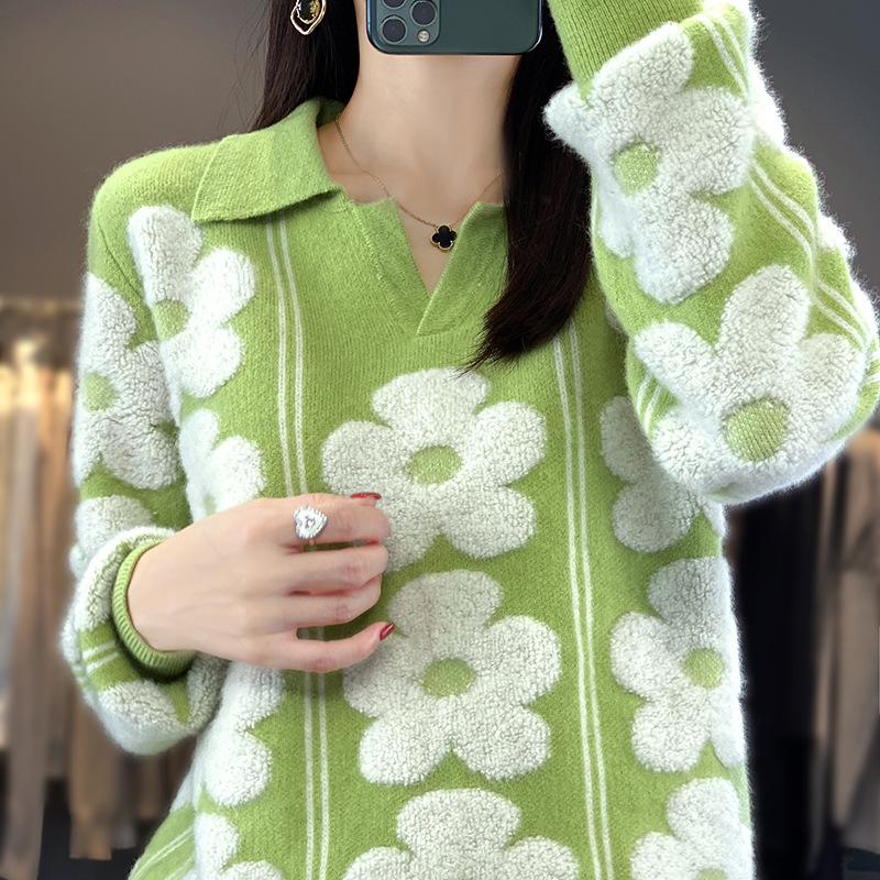 Кардиган с контрастным лацканом, утолщенный, для женщин, на осень и зиму, новый стиль, жаккардовый шерстяной свитер с цветочным узором, модная и универсальная базовая рубашка