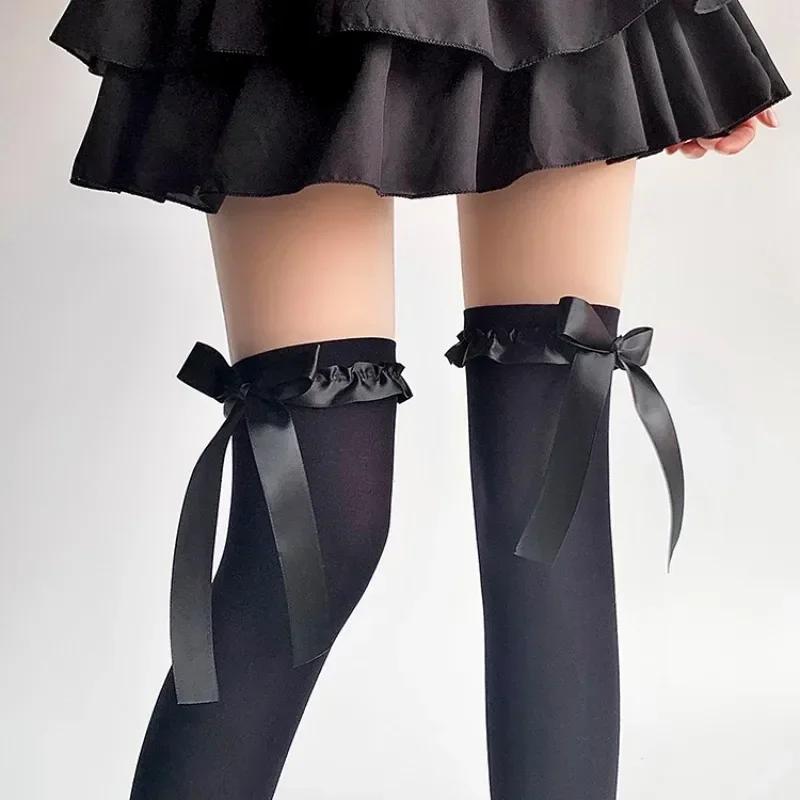 Женские деликатные бархатные чулки выше колена с бантиком Весна Лето Мягкие Лолита Отделанные кружевом ленты-бантики Jk Тонкие гольфы выше колена