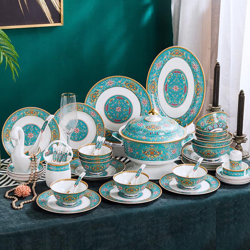 Набор эмалированной синей керамической посуды в европейском стиле, 60 предметов