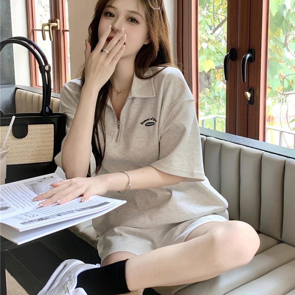 Комплект из 2 предметов: женская летняя толстовка и брюки, короткий рукав, застежка-молния, отложной воротник, эластичный пояс, свободные спортивные штаны, спортивный костюм, панкомбинезон
